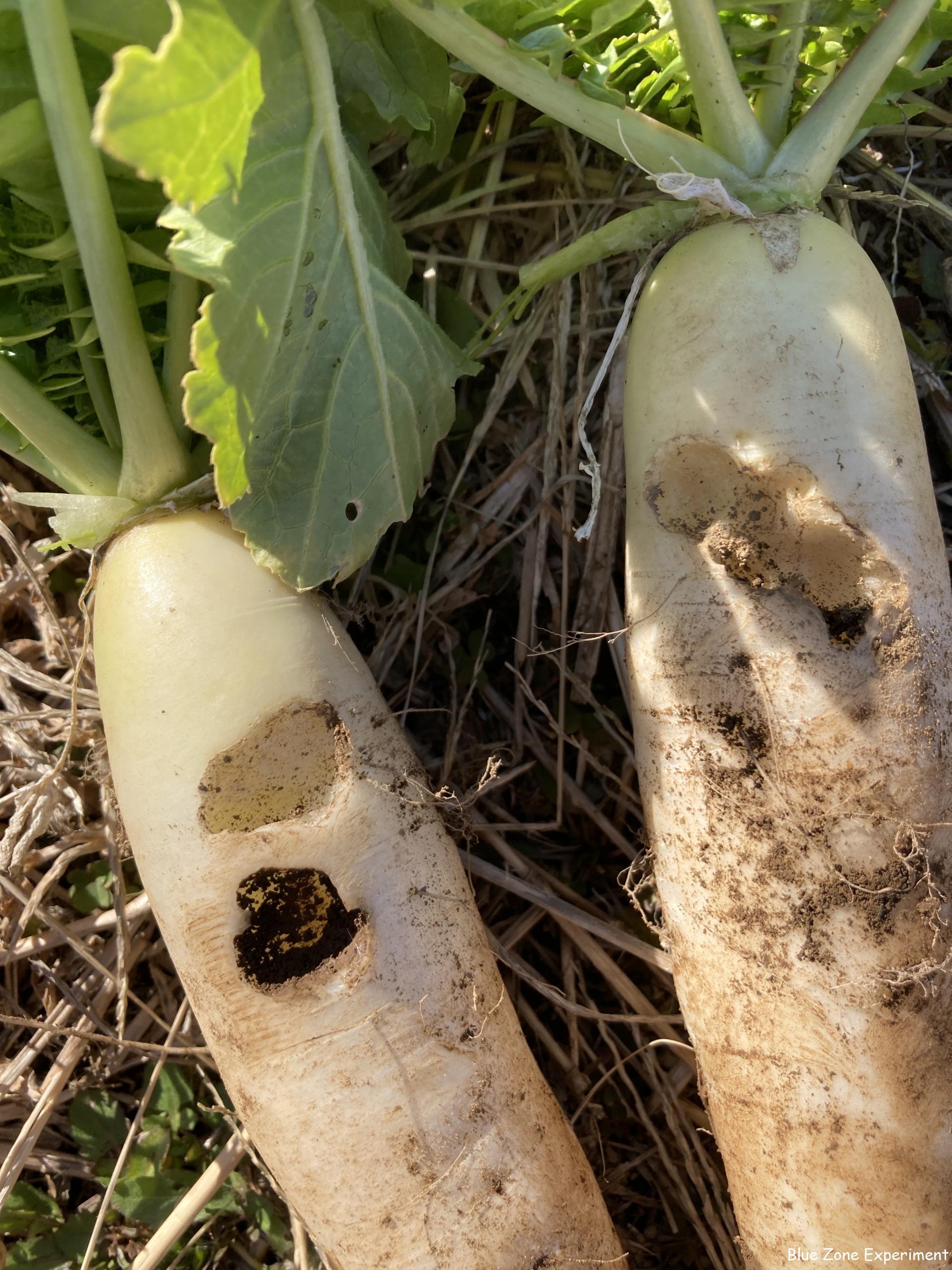 大根の成長を喜びながら見回っていると、わりと大きい大根一本と、まだ小さい大根二本が何者かにかじられているのを発見しました。地上に出ている部分がかじられています。犯人は分からないのですが、かじった跡が虫にしては大きいので、小動物ではないかと思います。ネズミでしょうか? どうせ食べるなら、何本もかじらずに、一本だけ丸ごと食べてくれれば助かるのですが、そんなこと、動物の知ったことではないですね……。