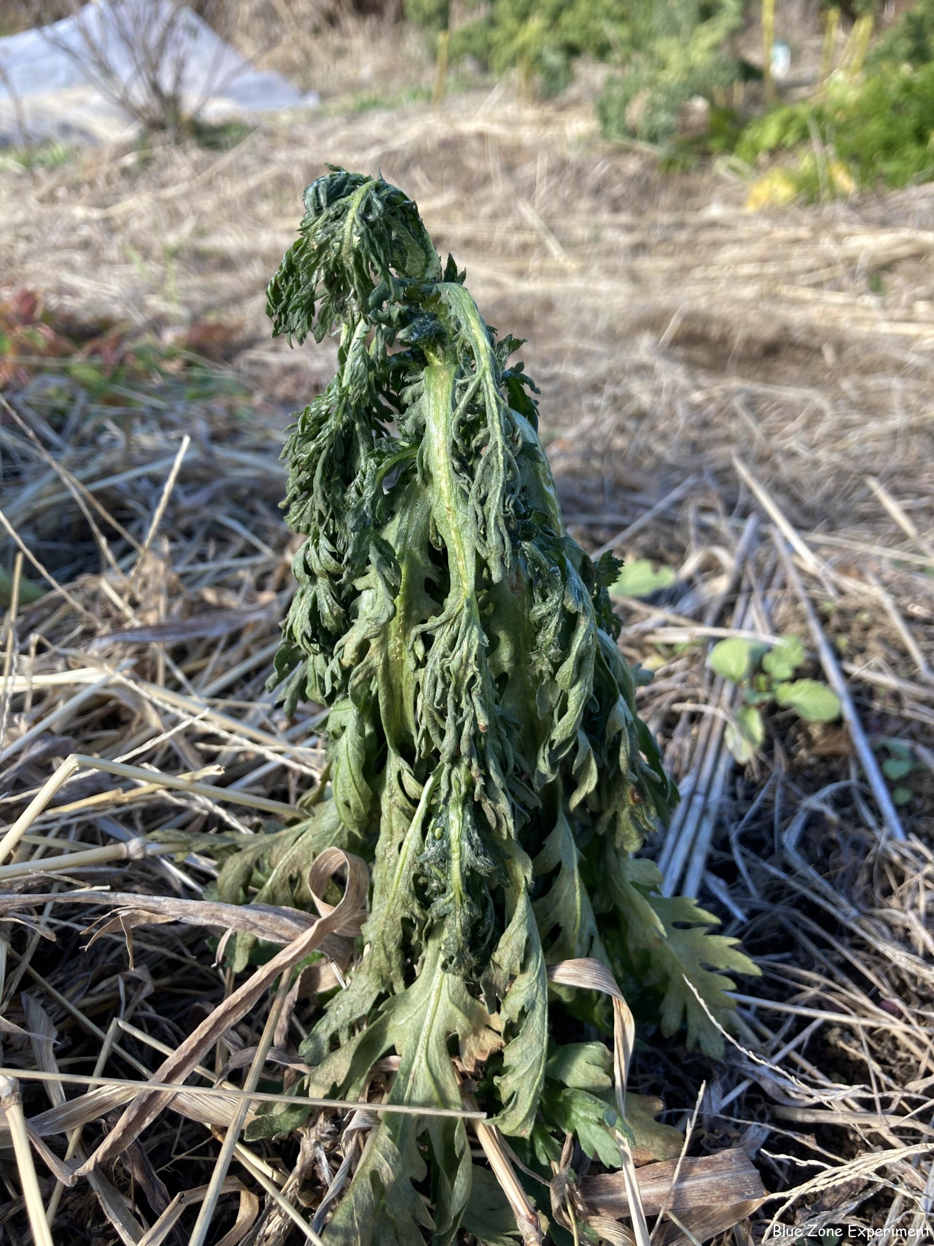 前回畑に行ったときにもすでにかなり霜にやられていた春菊ですが、今朝は特に寒かったので、さらに被害が拡大していました。下の写真で分かると思いますが、すっかりしなびて駄目になっています。お昼過ぎでも、日陰にはまだ霜柱が残っている寒さです。それでも、一部の春菊は元気です。どうやら丈の低いものが助かっているようです。