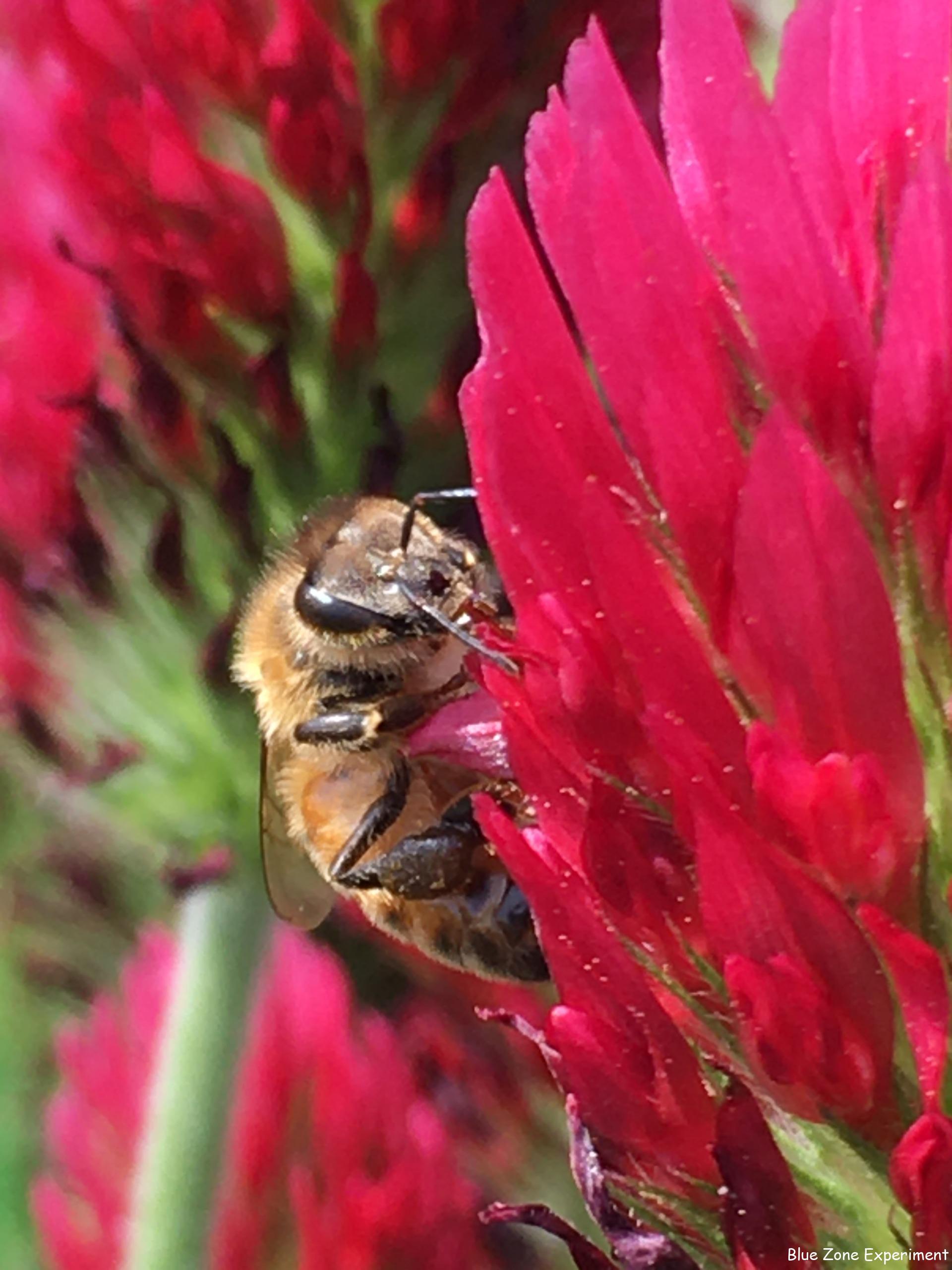 イチゴの畝の脇に咲く満開のクリムゾンクローバーには、ミツバチがたくさんきていました。イチゴの受粉を助けてくれているのはハナアブかと思っていましたが、どうやらミツバチのようです。ハナアブは、アブラナ科が好みのようで、少し離れた畝でよく見かけます。あたたかくなって、畑にくる虫の種類も増えてきました。