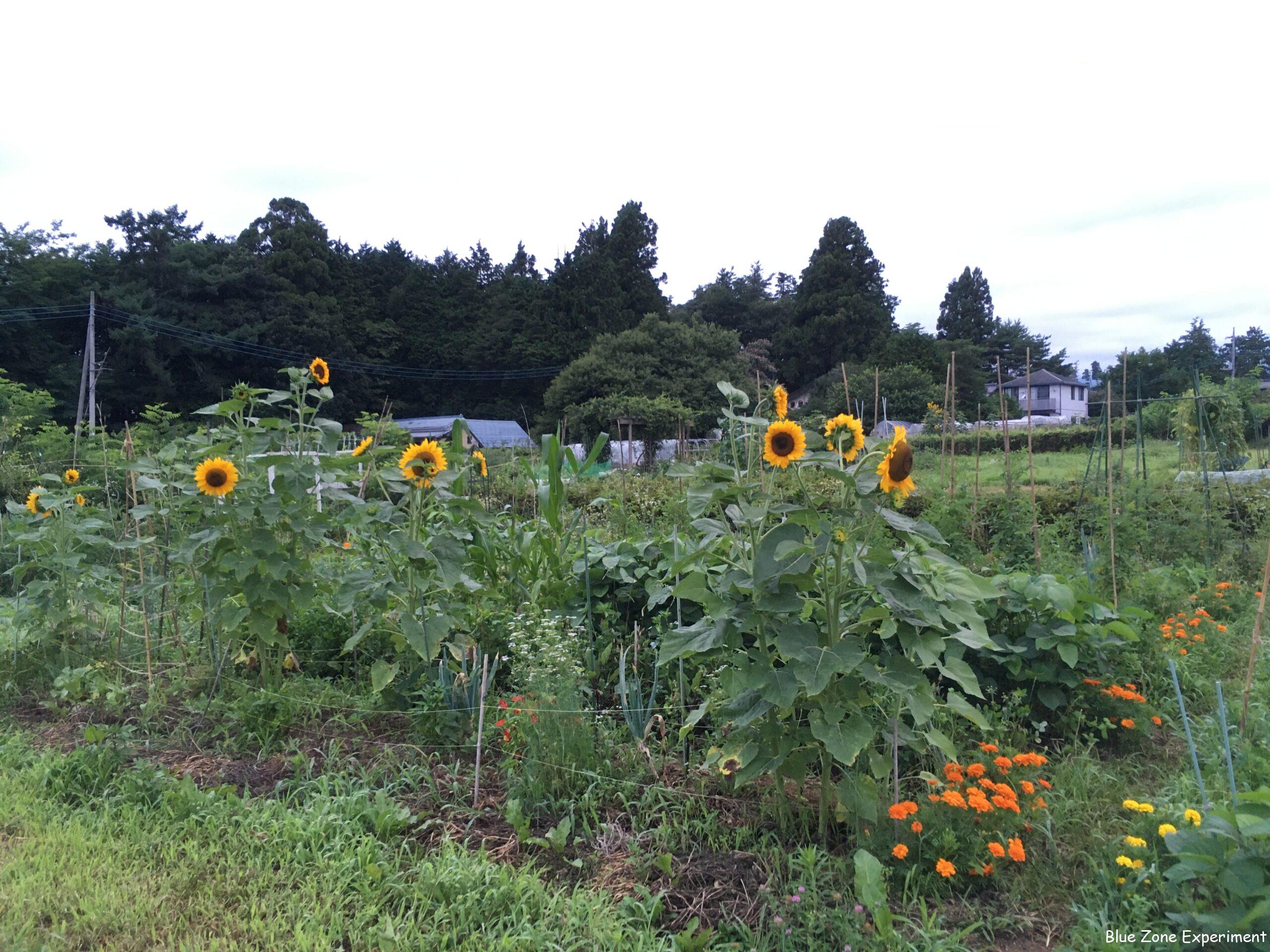 ひまわりがどんどん花をつけています。大きな花があると畑が華やぎます。虫もたくさん来てくれます。畑ではまだあまり見かけない、カマキリの赤ちゃんにも出会いました。そこら中で、小さなアマガエルがピョンピョン跳ねているのを見かけます。一年前とは生き物の種類も数もまったく違います。畑が豊かになってきた証拠です。うれしいことですね。