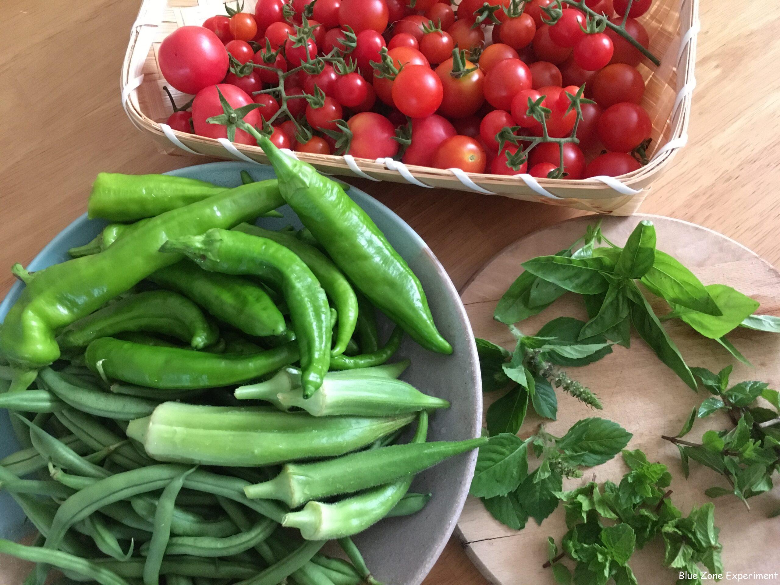 とうがらし類もたくさん採れました。去年は、パプリカ、ピーマン、甘長トウガラシと、どれもほとんど収穫できなかったので、今年は順調でうれしいです。しかもミニトマト同様、種から育てたので、喜びもひとしおです。つるなしインゲンは、何度かにわけて時間差で種をまいたので、途切れることなく収穫できています。オクラの収穫は、まだはじまったばかりです。ハーブ類も収穫しました。