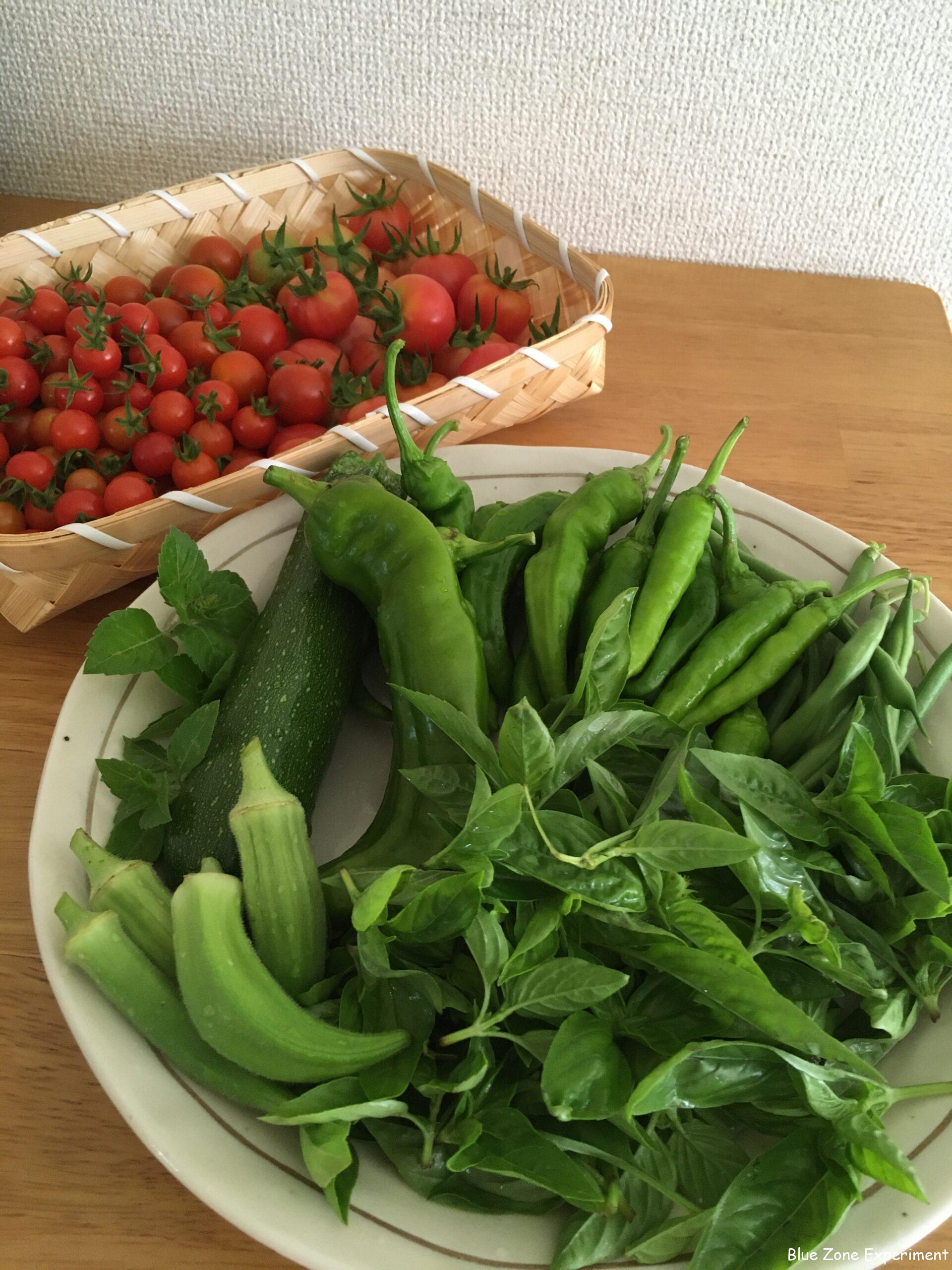 ミニトマトは大小合わせて 150 個ほど収穫できました。大量に採れるので、最近はおやつ代わりに食べています。はじめのうちは酸味が強いと感じたマッツワイルドチェリーも、最近は甘みが出ておいしくなってきました。雨が減ってきたからかもしれませんね。こぼれ種から育ったパクチーは、あまり収穫しないうちに花が咲いてしまい、今ではすっかり枯れているものもあります。今日は、乾燥したものを根元から切って持ち帰りました。少しだけ種として残し、あとはスパイス(コリアンダー)として利用します。今はベランダで陰干し中。他には、おなじみのとうがらし類、オクラ、ズッキーニ、バジルなどを収穫しました。とうがらし類は、生で食べてもおいしいです。ズッキーニも生でもおいしいですが、ぬか漬けにするとマヨネーズのような風味でとてもおいしいので、たいていはぬか漬けにしています。大きく育ちすぎた場合は、ズッキーニケーキに利用します。バジルは先端だけを摘み取っていますが、すぐに新芽が伸びてくるので、思う存分収穫できます。