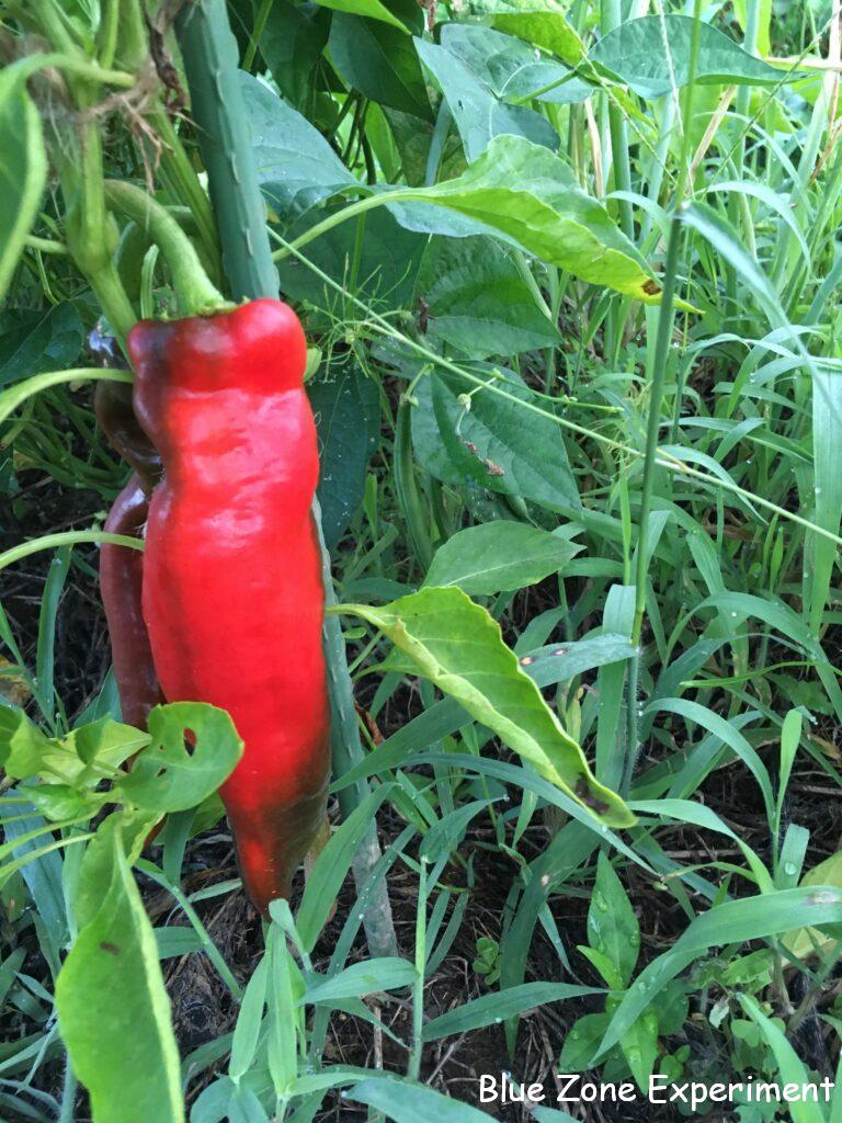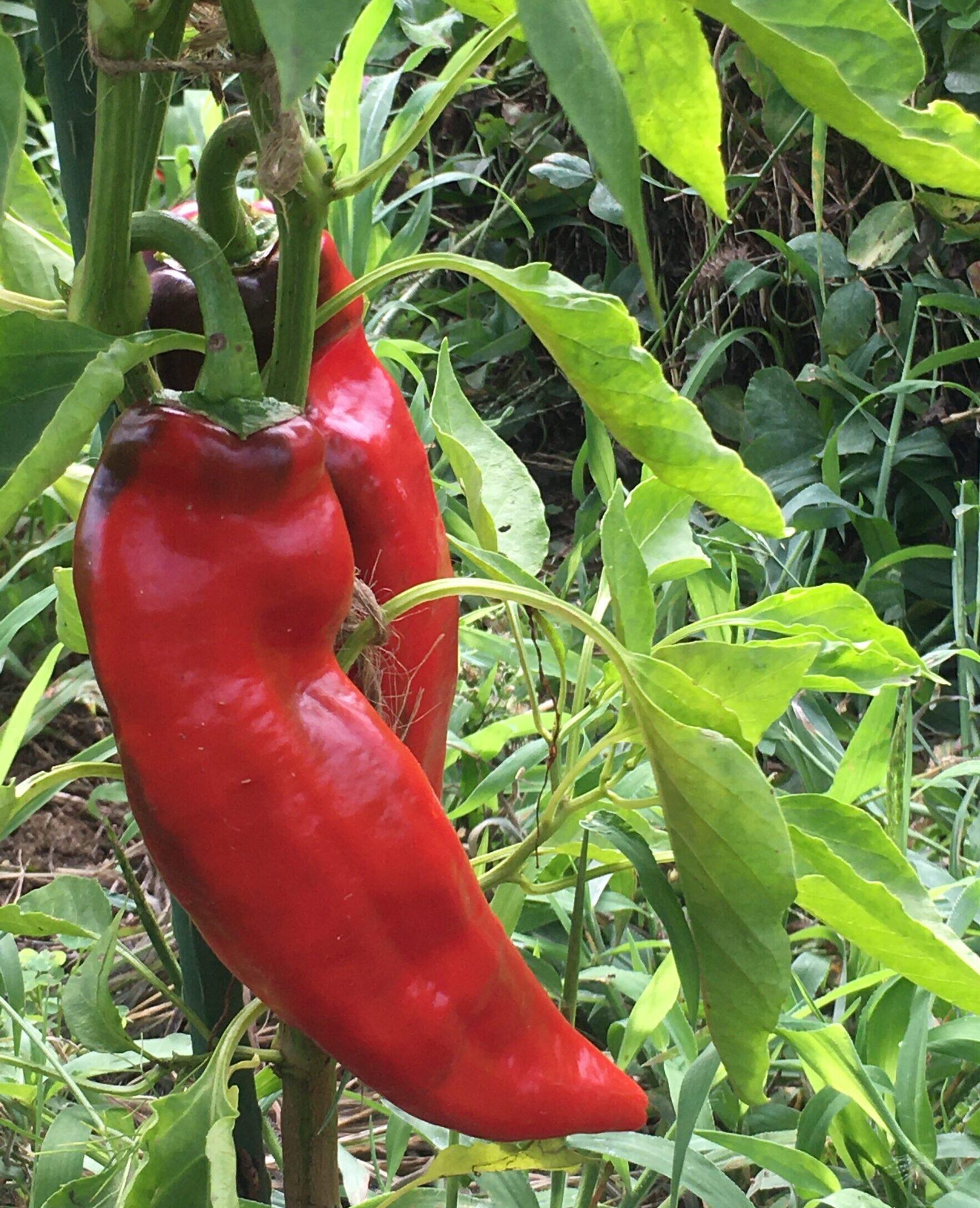 去年スーパーの地元野菜コーナーで買った真っ赤なパレルモが甘くてとてもおいしかったので、種を採っておきました。その種を今年の 3 月にポリポットにまき、その後家で大切に育苗し、5 月に畑に定植しました。最初のうちは気温が低すぎたり、アブラムシにやられたりで危ない時期もありましたが、それを乗り越えて、今は真っ赤な実をつけています。今日は、1 つだけ初収穫。5 か月以上かけてここまで育ったものなので、心していただきたいと思います。
