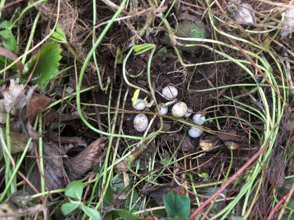 8 月 16 日にワイルドストロベリーの茂みで見つけた 謎の卵 は、まだそのまま残っていました。また草をかぶせて隠しておきます。今日は畑の脇の道でカナヘビを見たので、カナヘビかもしれませんね。触ってみると、やや弾力のある卵でした。