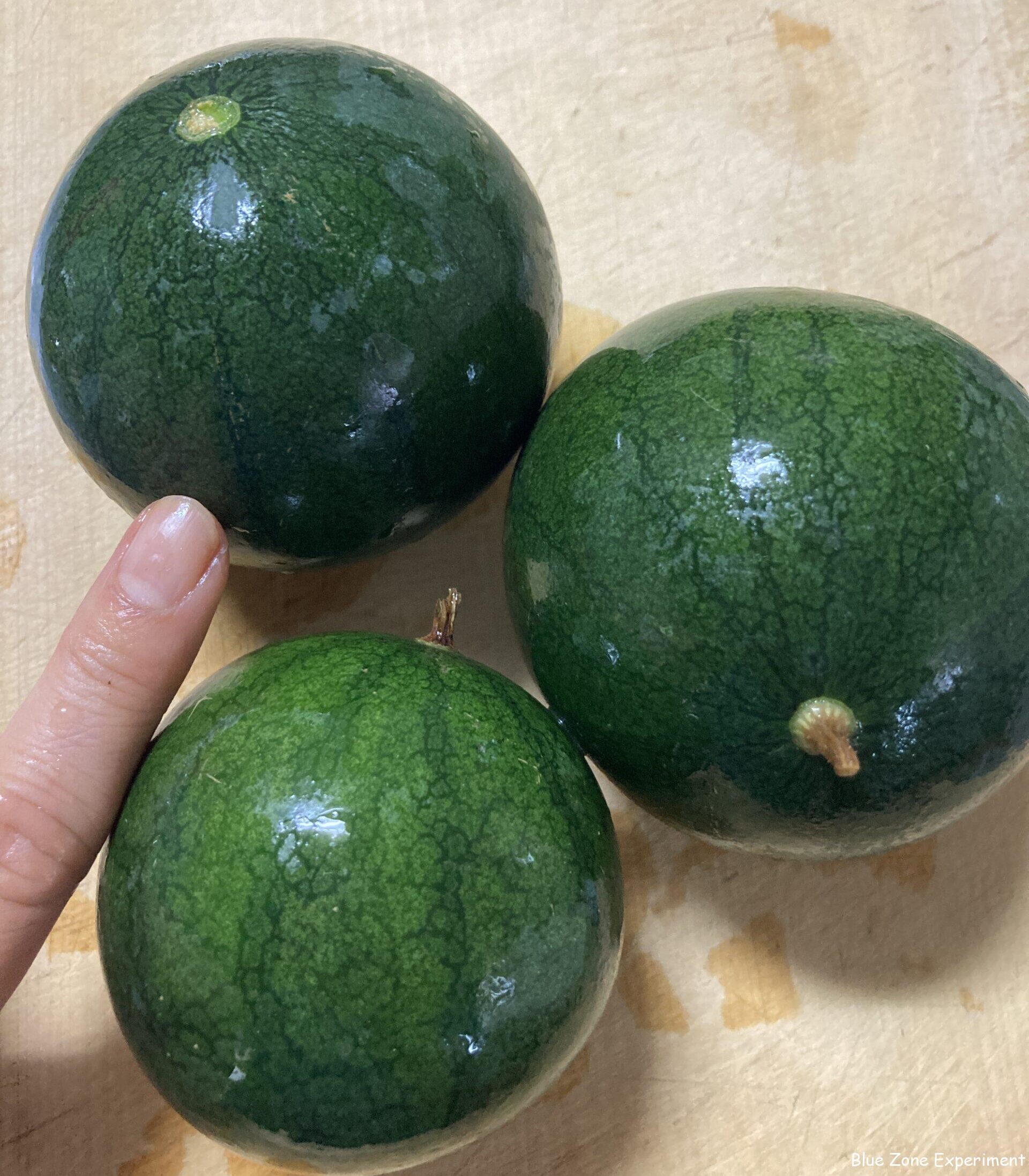 小さいまま成長しない小玉スイカ。葉っぱもなくなり、ツルも枯れているので、これ以上どうしようもないのは明らかです。あきらめて、ツルが枯れたものを 3 玉、小さいまま収穫することにしました。それ以外に、オレンジ小玉スイカが 1 つ割れてしまっていました。残っているのは、今日収穫した程度の大きさのものが一つ、それよりも若干大きいものが一つ、小指程度の小さいものも一つあります。今年のスイカは、ウリハムシを避けるためにあんどんに入れて過保護に育てましたが、結果的に、何もしなかった去年の方がよかったので、もしかしたらあんどんで日照が妨げられたのがよくなかったのでしょうか? 植え付け時にホットキャップという透明のプラスチックでできた保温用のカバーを付けているのをよく見ますが、そういう苗は、よく成長しているようでした。まだ寒い時期に保温して、初期生育を助けるのが重要なのかもしれません。次回の課題です。