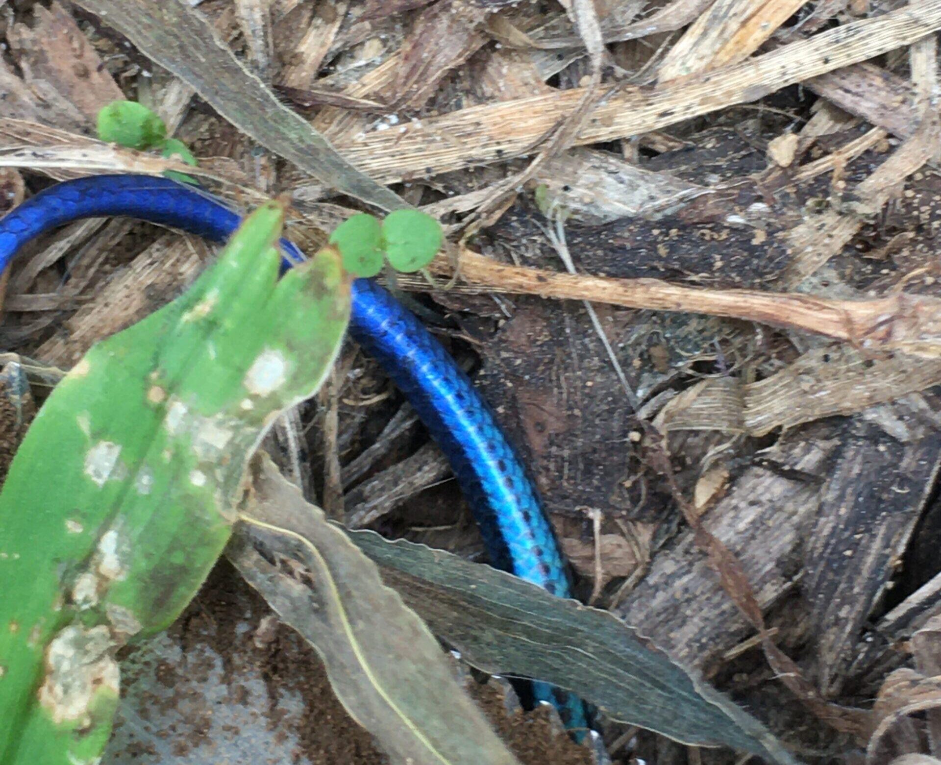 草整理をしているときに、突然、ミミズのようなものが飛び出してきました。ミミズのようなものと言っても、形がミミズに似ているだけで、色は金属的な青色です。その生き物は、ピョンピョンとはげしく跳ね回っています。見たこともない美しい色に魅了され、こんなきれいな虫がいるのかと驚いて写真を撮るうちに、もしやこれはニホントカゲのしっぽでは? と気づきました。おそらく草の下にいたトカゲが、驚いてしっぽを切り離して逃げたのだと思います。とにかく、そんなシーンを見たのは、生まれてはじめてです。切り離されたしっぽがピョンピョンと激しく跳び回っているのは、なんとも言えない不思議な光景です。あとで調べてみると、切り離したしっぽは再生するものの、元通りのしっぽにはならないようです。骨は再生せずに、軟骨がその代わりとなるとか。しかも多大なエネルギーを消費するので、トカゲにとっては、大きな負担になってしまうようです。知らずにやったことではありますが、トカゲに悪いことをしてしまいました。