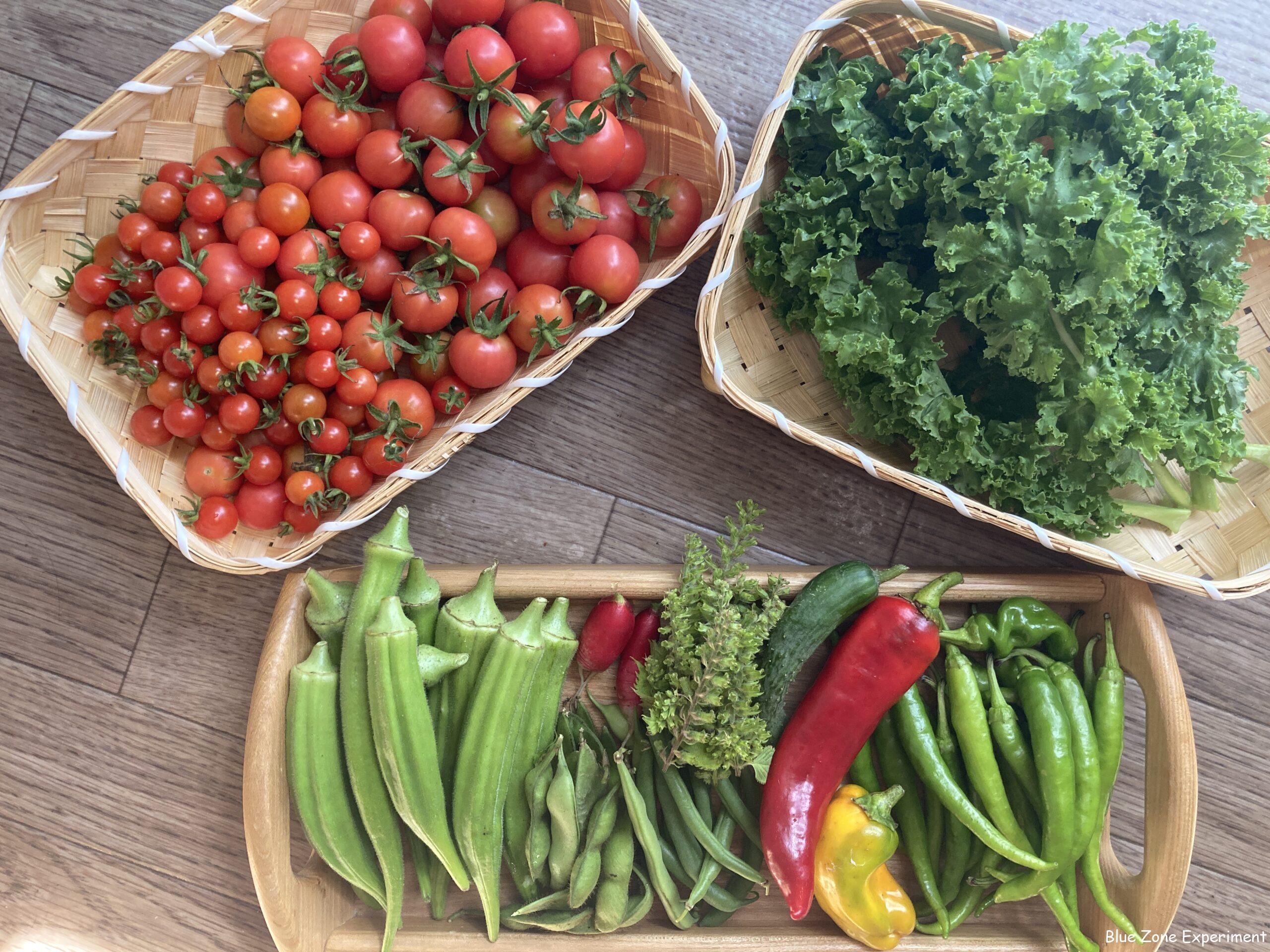 ミニトマトは、今日は全部で 120 個程度。今日は、イタリアンミニトマトの実が赤く色づいているのが目立ちました。蛾に吸われてダメになっているものを捨てながら収穫しましたが、前回と比べると、被害は減っている印象です。ケールは、今日もきれいなものが採れました。とうがらし類は、多くの株は元気なので、まだしばらくは収穫できそうです。今日は、少し変形した黄色と赤のパレルモが収穫できました。オクラは、もう一つ勢いに欠けるものの、今日はいつもより多めの収獲です。シソの穂も採りました。枝豆もほんの少しだけですが、莢が膨らんだものを収穫しました。小さなラディッシュとキュウリも採りました。小さなものでも、漬物にするとおいしいです。