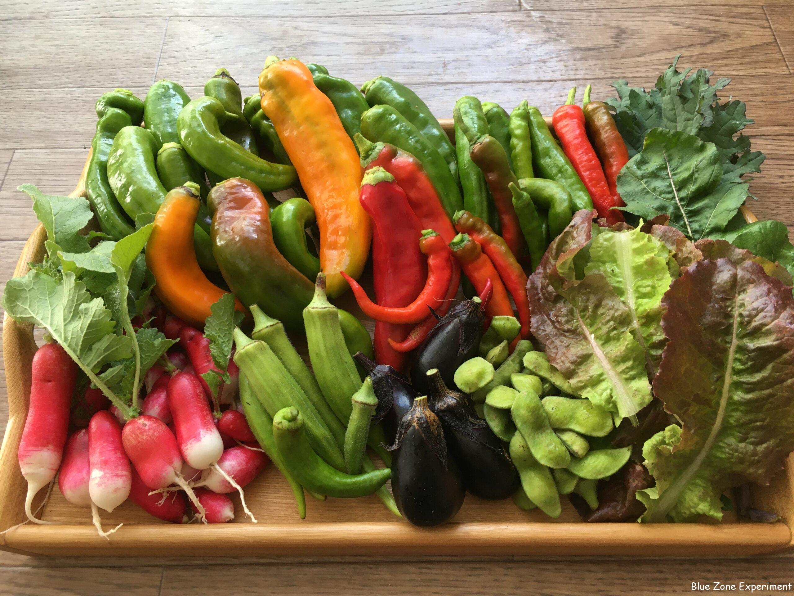 霜のため、夏野菜は、ほぼ最後となる収穫です。パレルモは、色付いているものは少なかったものの、大きい実がそれなりに採れました。これまでは赤と黄色でしたが、オレンジ色の実も採れました。万願寺とうがらしもすべて収穫しました。枝豆の間にサンドイッチ状態でずっと日照不足でしたが、よく頑張ってくれました。伏見甘長とうがらしは、まだ少し残してありますが、種取り用の赤くなったものを収穫しました。ラディッシュは、小さいですが、実が割れる前にすべて収穫しました。他のいろいろな種と混ぜてまいた分は、葉っぱも虫食いがなくきれいでした。オクラと水ナスも最後の収獲です。枝豆は、今回もきれいなものだけ少し収穫しましたが、カメムシの被害が増えてきたようなので、もう終わりだと思います。レッドロシアンケール、サニーレタス、ルッコラも収穫しましたが、これらの野菜はこれからです。