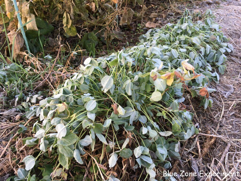 グリーンピースの種をまいたところには、夏野菜の残渣を利用して霜よけをしましたが、今日はその効果を確認しました。北側の霜よけの手前にはニンジンとサニーレタスがありますが、どちらも霜がついていません。ただ、霜よけが枯れて枝だけになってしまうと効果がなくなりそうなので、随時何か足していった方がよさそうです。