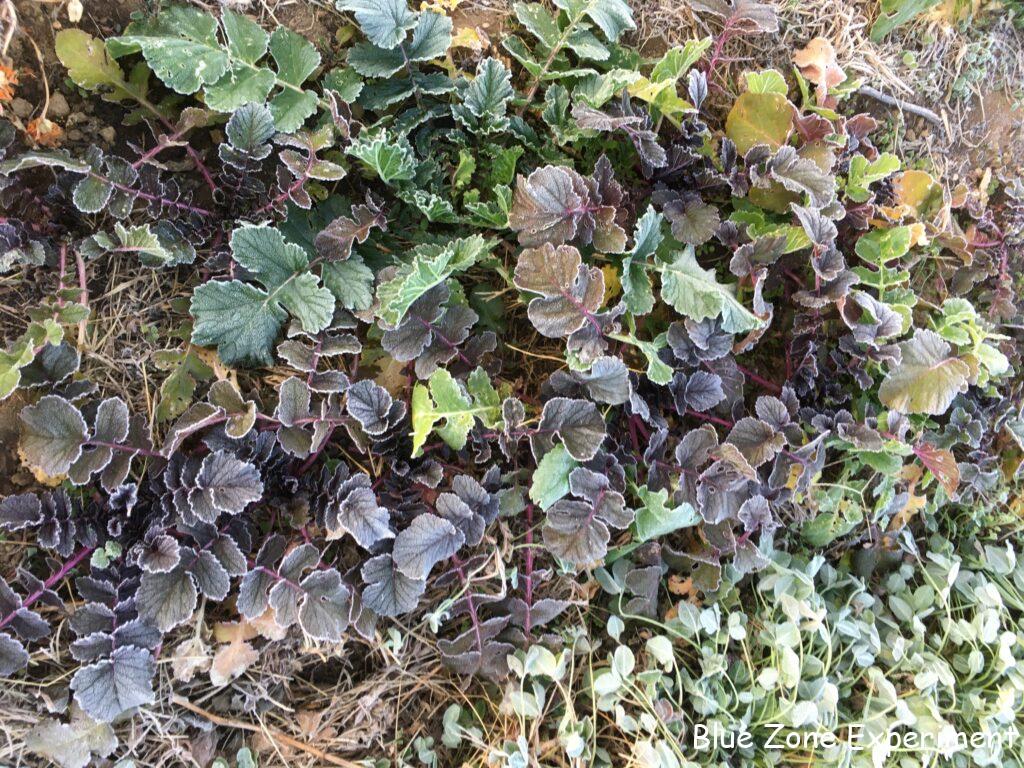 寒さに強いはずのクリムゾンクローバーでも、こんな風にすっかり凍っているのを見ると心配になります。雲仙赤紫大根は、なかなか大きくならないなぁと思っていたのですが、毎朝のように冷凍されているからに違いありません。タケノコ白菜は、触ってみると葉っぱが凍ってゴワゴワです。それでも、前回見たときより成長しているようなので感心します。