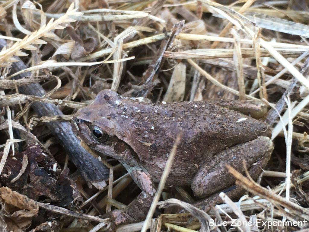この寒さでは、さすがにあまり生き物を見かけません。昼間にはもっと出てくるのかもしれませんが、9 時には畑をあとにしたので、写真を撮ったのはバッタとカエルのみ。でもきっと、草マルチの下では、いろいろな生き物が生活しているのでしょうね。