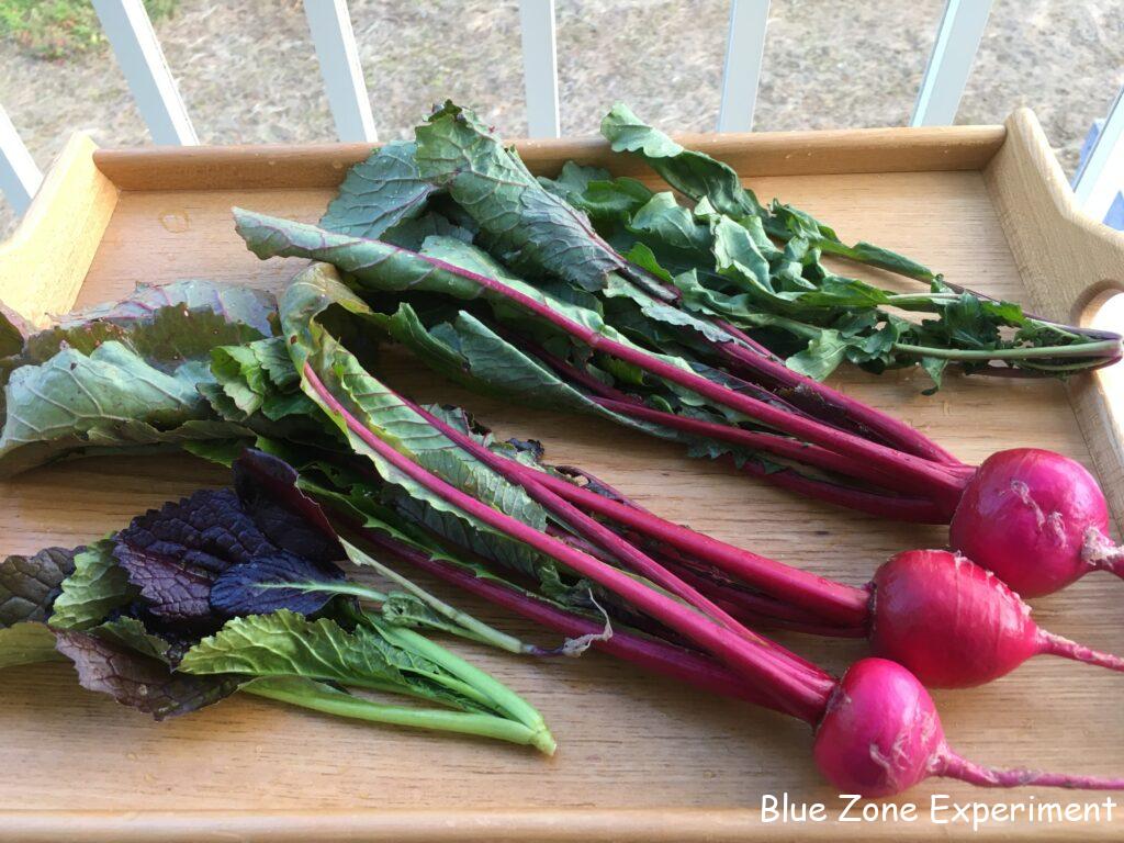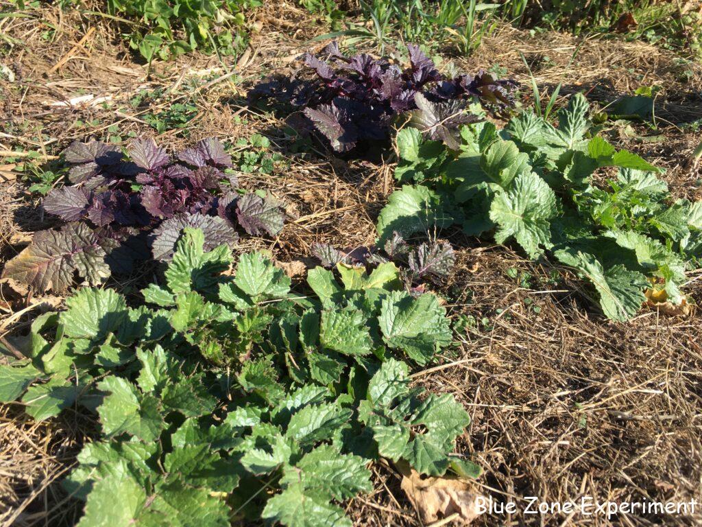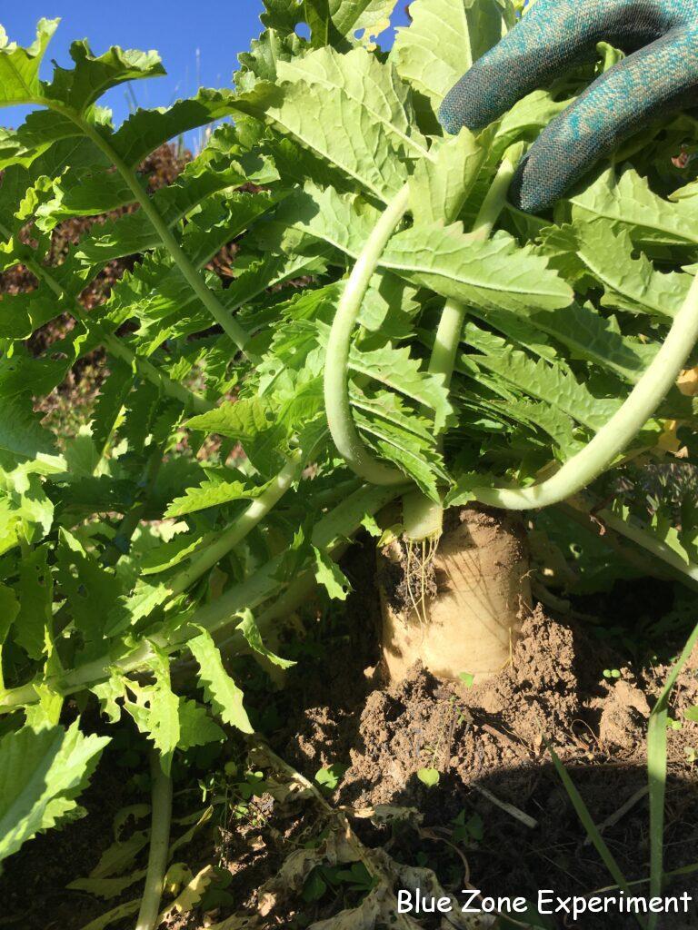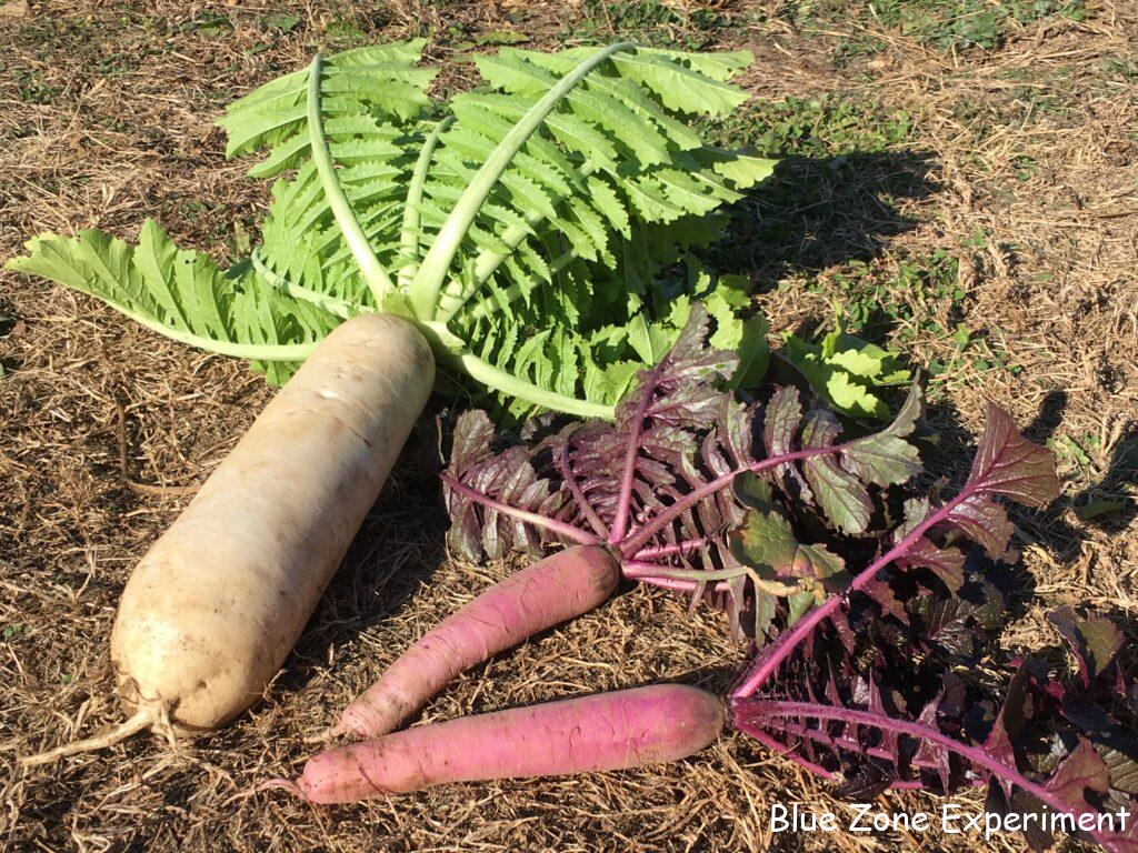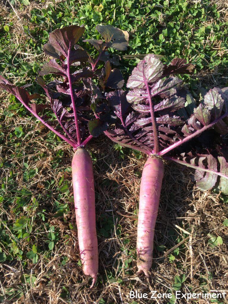大蔵大根が地面からせり上がってきています。抜いてみると、前回同様、しもぶくれの立派な姿です。雲仙赤紫大根は、ロゼット状になってしまって、あまり成長していないようです。二本抜いてみると、予想通り小さい大根でしたが、まっすぐで美しい色の大根でした。大根菜がたくさんあるので、使い切れない分は、茹でて冷凍しようと思っています。