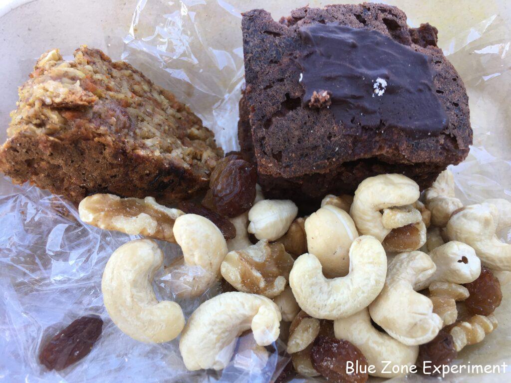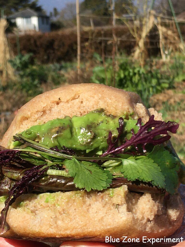 今朝は遅めに畑に行って少し作業したあと、畑を眺めながら、持参のお弁当を楽しみました。収穫したばかりのサニーレタス、ルッコラ、赤カラシナ、パクチーを少し収穫し、その場で洗って、持ってきたアボカドサンドにはさみました。パンは、昨日焼いた小麦ふすま入りのパン。畑で採って乾燥させてあったローズマリーも入っています。おやつは、昨日焼いた豆腐バナナケーキと、今朝焼いたキャロットケーキ、それとナッツにレーズンです。飲み物はあたたかい麦茶ですが、これは今年収穫した大麦で作った自家製です。どれもおいしくて、しばし至福の時を過ごしました。