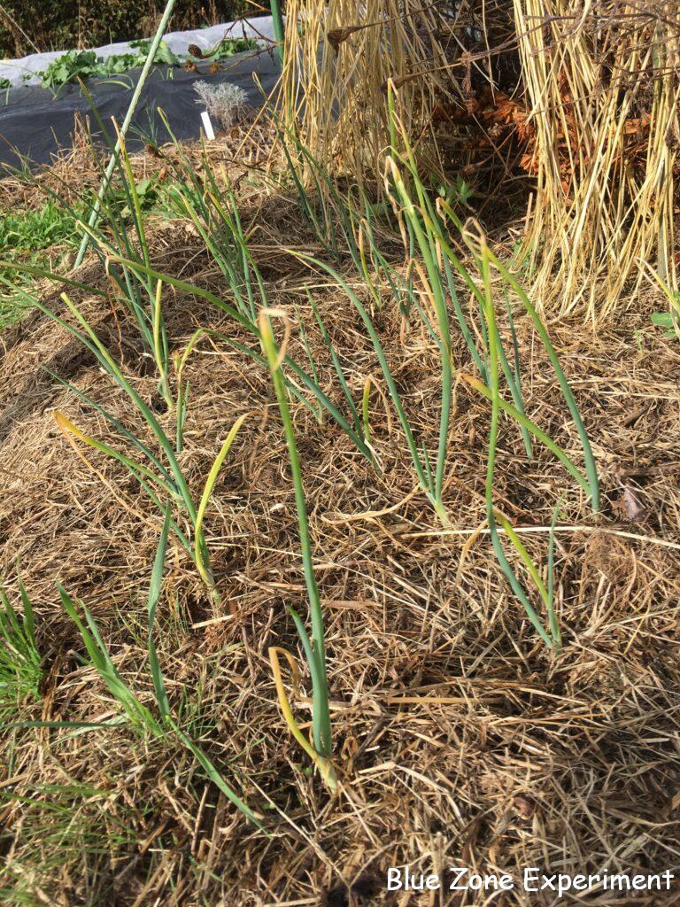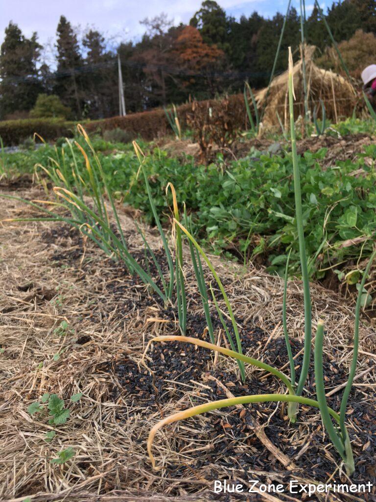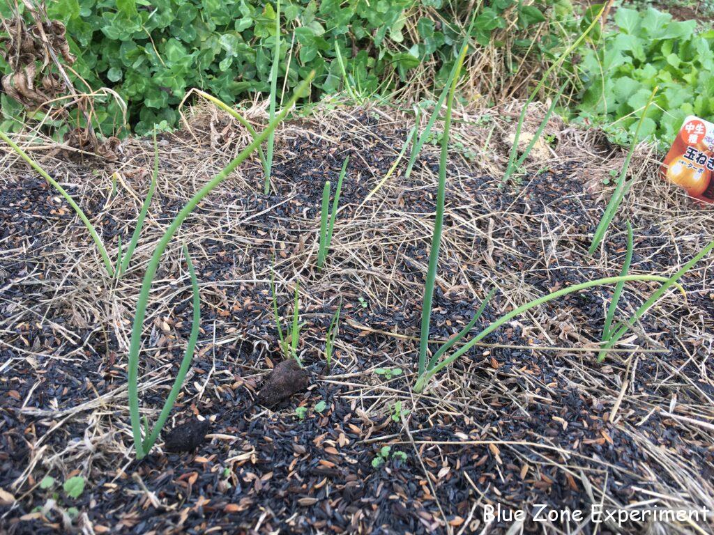 タマネギは、とくに元気そうにも見えませんが、悪くなっているようでもないので、こんなものなのでしょうか? 株元にもみ殻燻炭をまいてみました。来年には、自家製ボカシで追肥をする予定です。