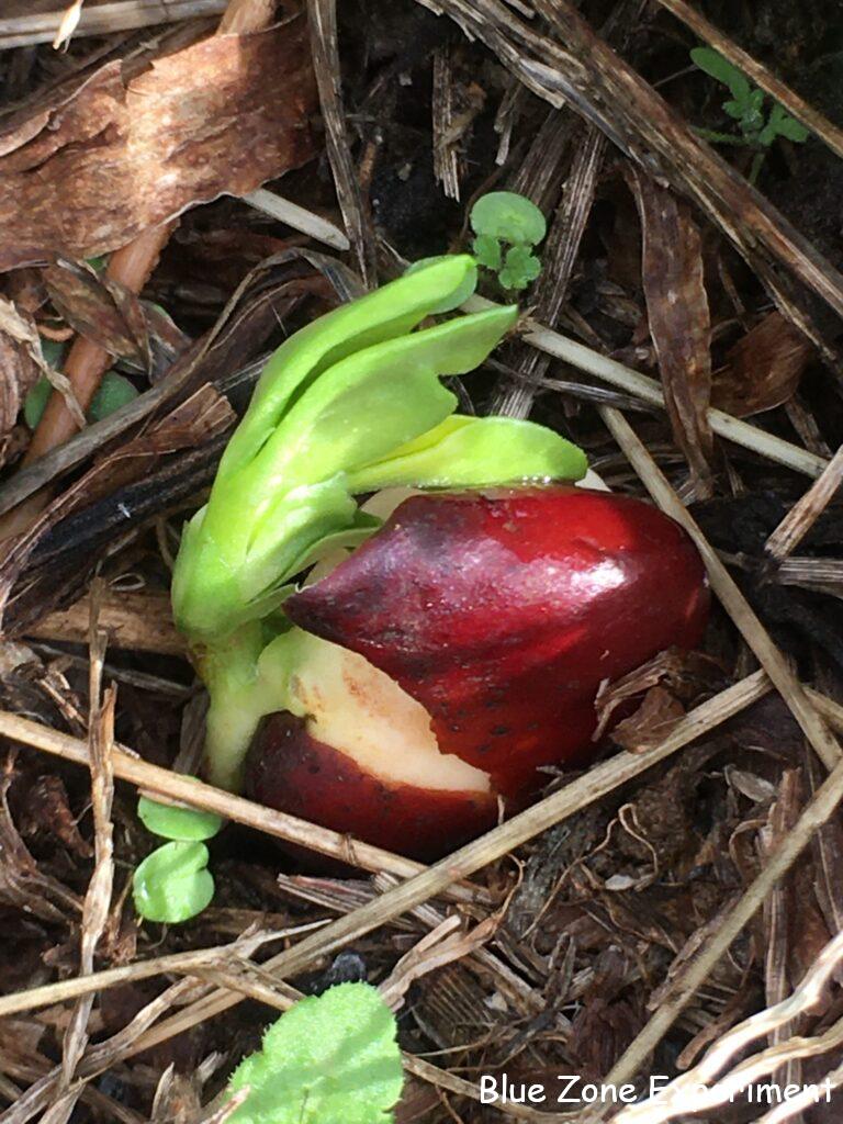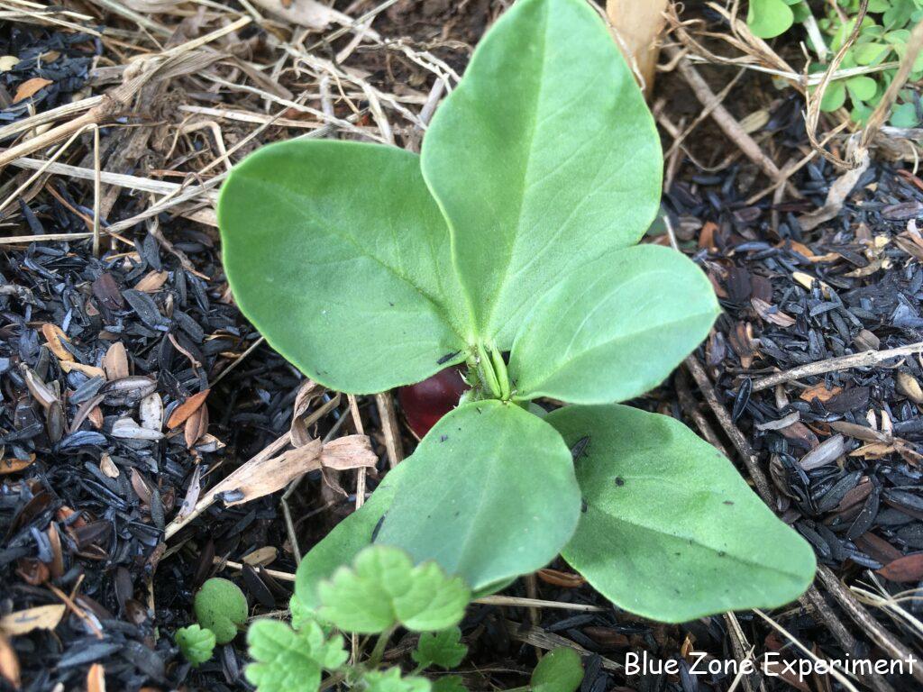赤そら豆は、ずいぶん前に種をまいたものの、なかなか種皮がとれないものがありました。おそらく雨が少なく、乾燥していたためだと思われます。幸い、昨日から今朝にかけてかなり雨が降り、水分で皮がやわらかくなったようで、とうとう芽が出てきていました。まだ全く発芽していないものもあるのですが、多めに種をまいたので、発芽したものだけでも本数は十分そうです。