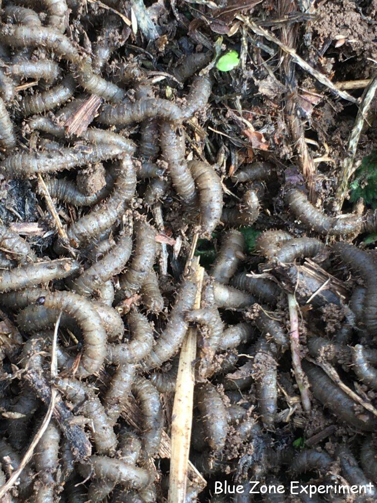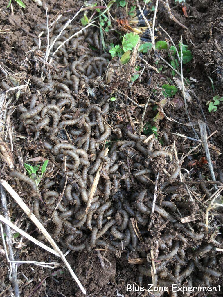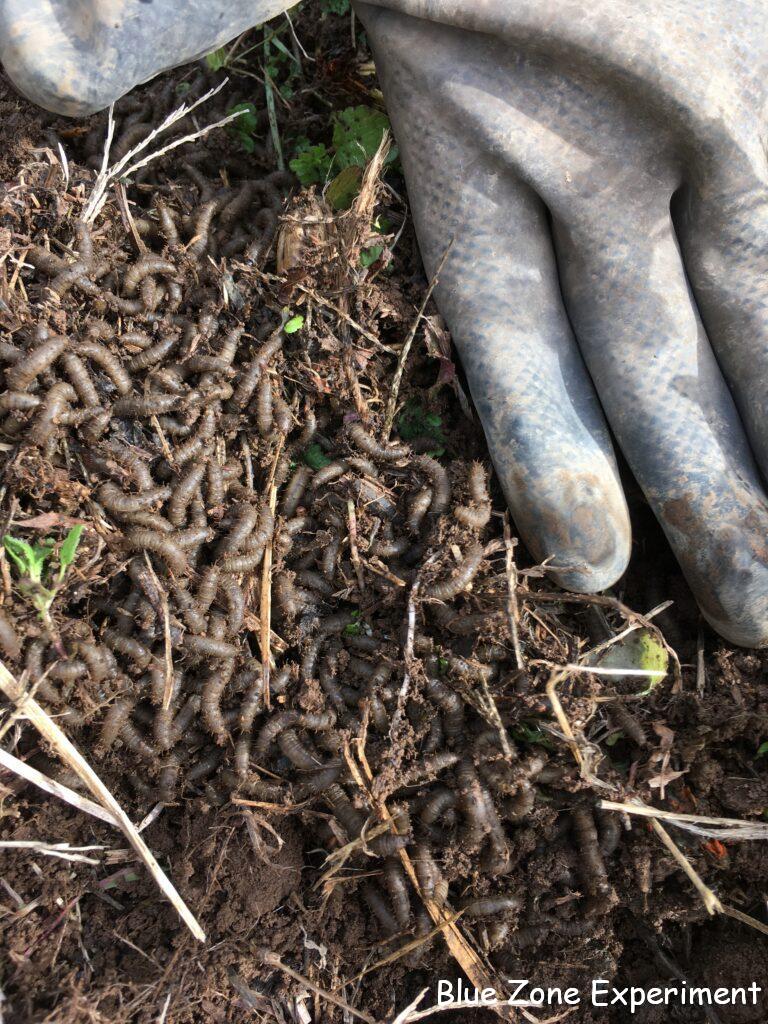 以前、ニンニクの根元でケバエの幼虫を見つけてびっくりしましたが、今日また発見してしまいました。通路の土を少し畝に上げようと、通路上の半分朽ちた草をよけると、うじゃうじゃとうごめく大量の幼虫。ニンニクの根元にいたものよりも白っぽい感じです。有機物を分解してくれるありがたい存在なので、よけた草をもどしてそっとしておきました。
