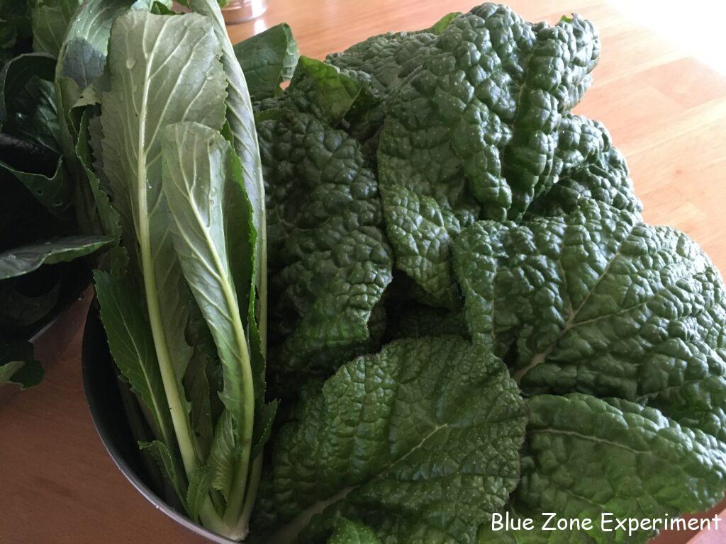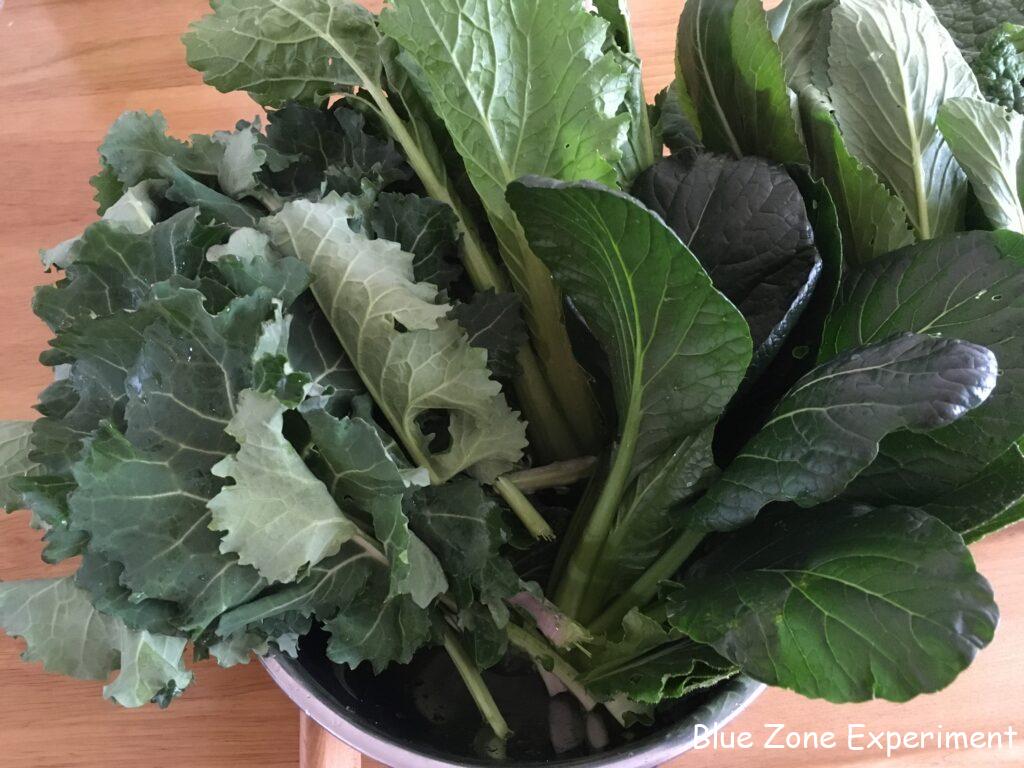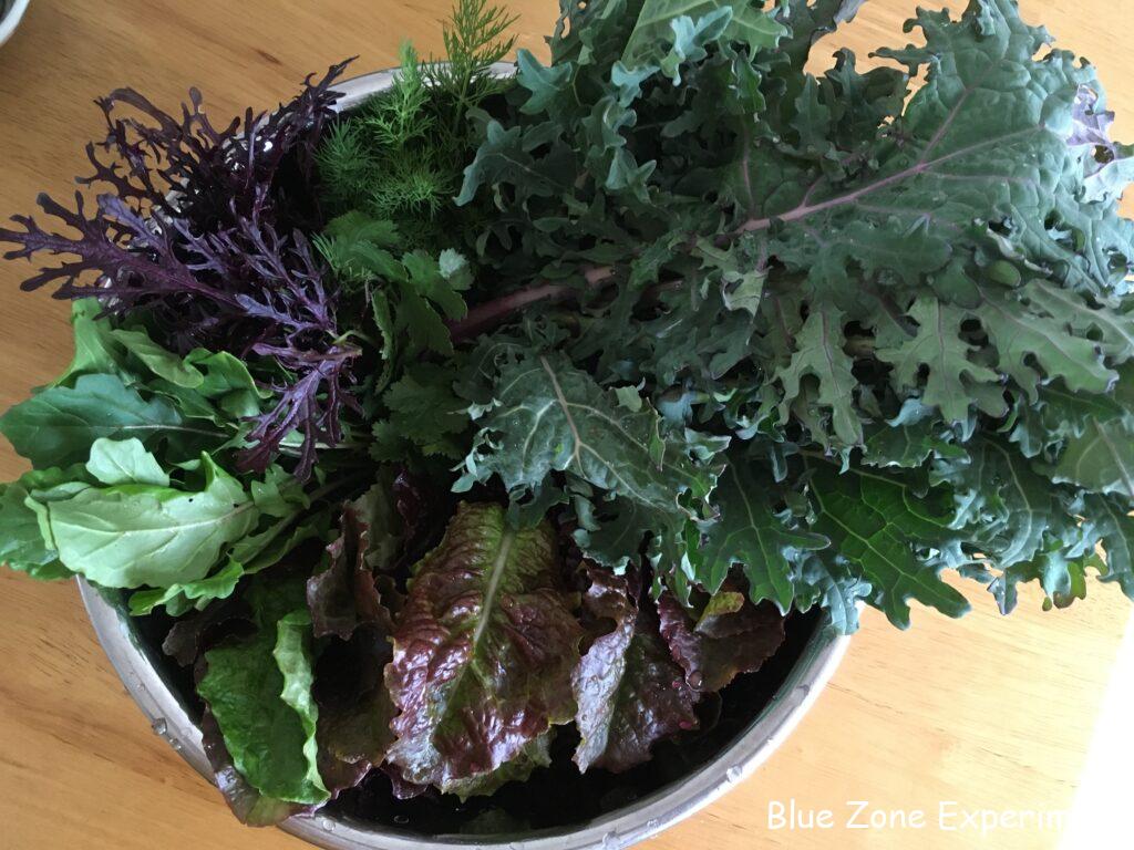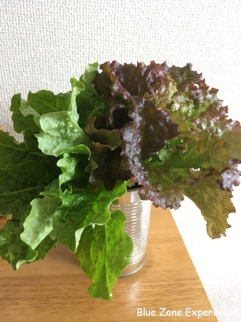 葉物野菜もたくさん収穫しました。のらぼう菜、タケノコ白菜、小松菜、壬生菜、カツオナ、レッドロシアンケール、サニーレタス、グリーンリーフレタス、赤カラシナ、ルッコラ、ディル、パクチー。一部のサニーレタスとグリーンリーフレタスは、根っこから抜いて水につけました。欲しい分だけとって食べる予定です。空き缶に水を入れて挿しただけですが、なかなか美しく、花を飾っているような感覚です。青菜類は、冷蔵庫にも入りきらないので、さっと茹でて小さくしました。和え物や汁物に使います。