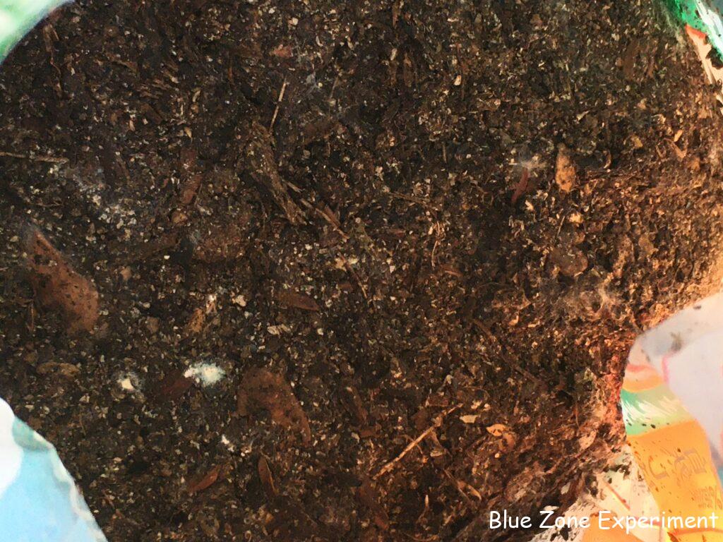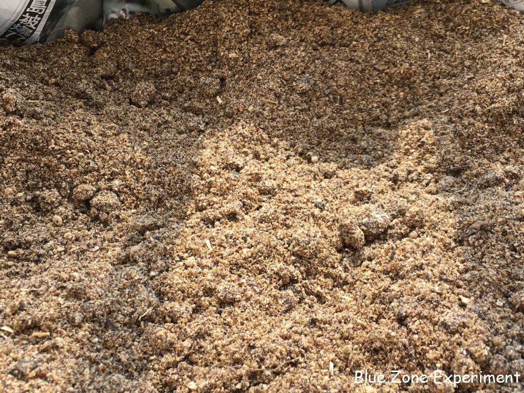 冬の間、約 3 か月熟成させた嫌気性のボカシ使って、ニンニクとイチゴの畝、それからタマネギに追肥しました。ボカシを作ったのははじめてなので、十分熟成しているかは不確かなのですが、ぬか漬けのような匂いがして、白い糸状菌らしきものも出ていたので、きっとできているのだろうと判断しました。とはいえ不安なので、ほんのちょっとしかまいていません。残りは、ベランダでサラサラになるまで乾かして、保存できる状態にします。