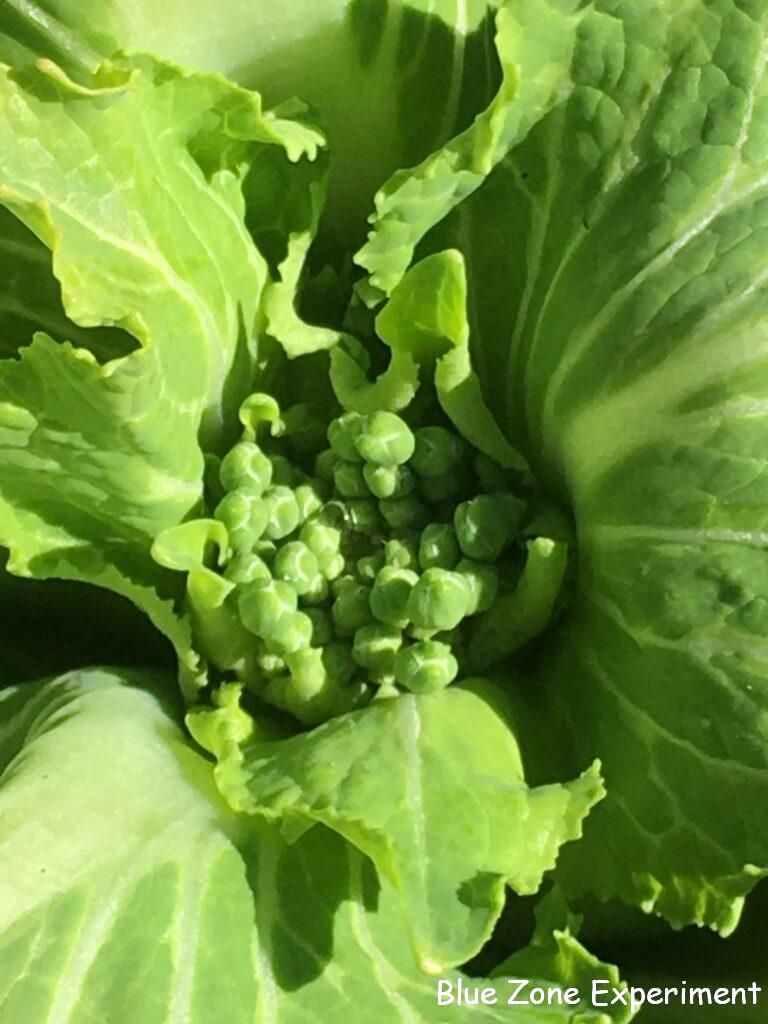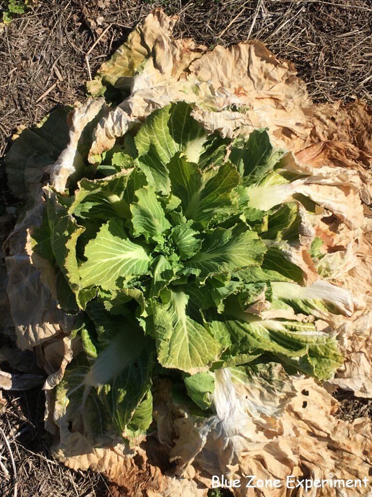 晩秋に葉っぱを何枚か取って食べたタケノコ白菜ですが、大きくなった二株がどちらも生き残っていました。特に大きな方の株は、花芽ができて来ていたので、次回は菜の花が食べられそうです。