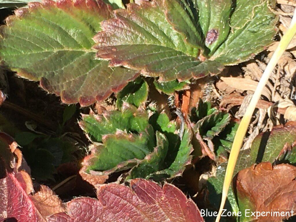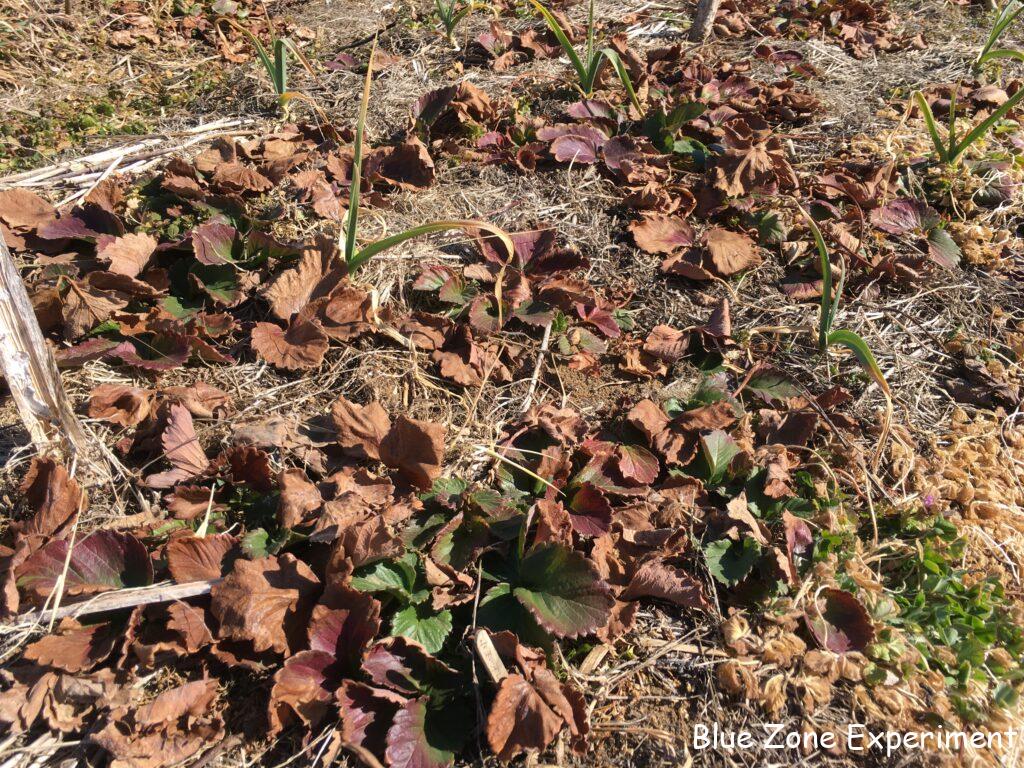 寒さに強いイチゴとニンニクは、ちゃんと生き残っていました。畝中に広がったイチゴは、ほとんどの葉が枯れてしまって、一見ダメになったかのように見えますが、よく見ると中心からは新しい葉が出ています。ニンニクも葉先は枯れていますが、全体的には健康そうです。別の畝のワイルドストロベリーも、周りの葉っぱはほとんど枯れていますが、イチゴと同様に中心は元気です。