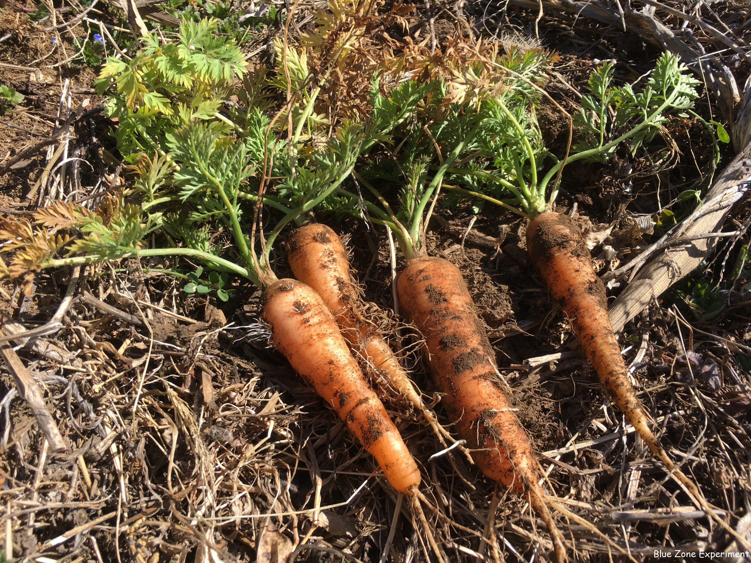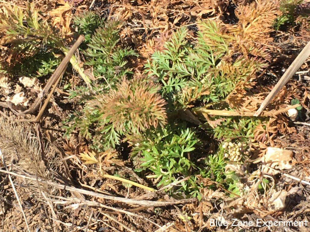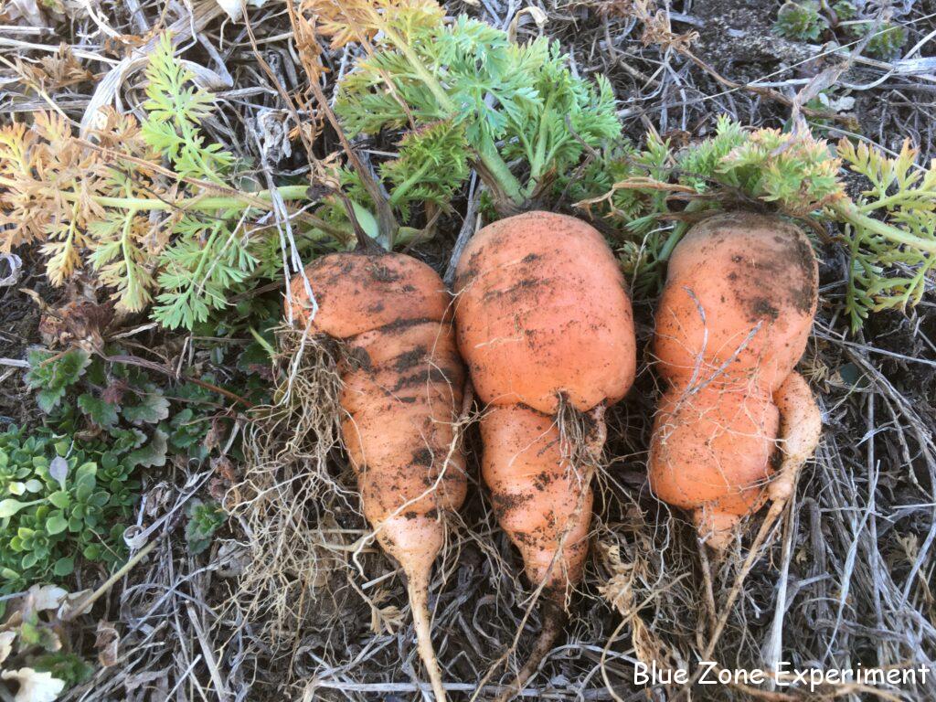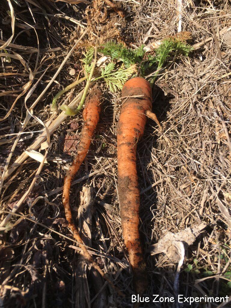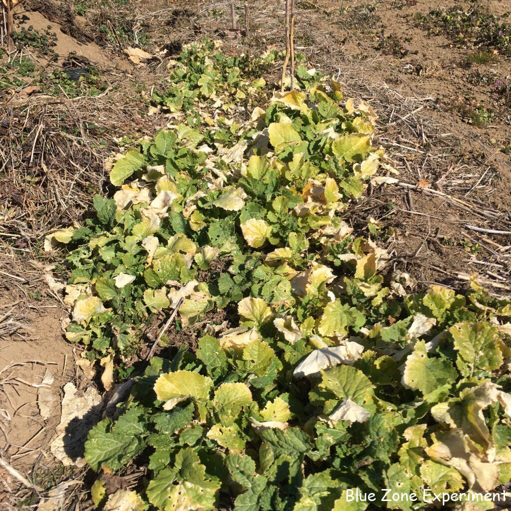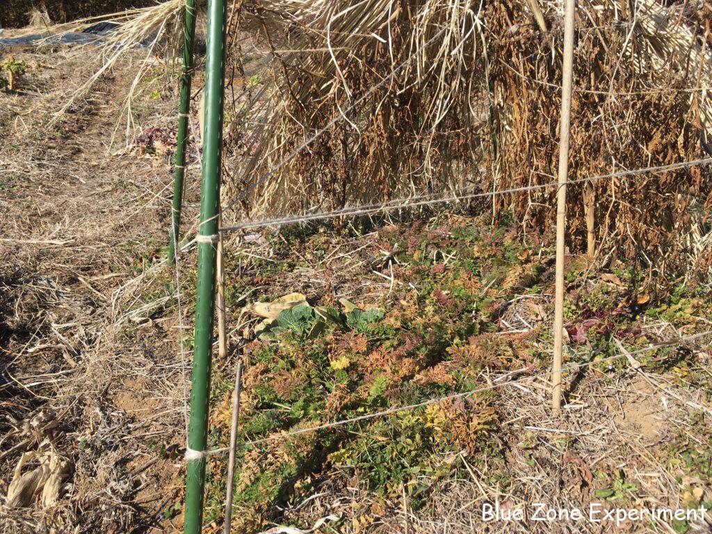 隣の畑との境界に種をまいたカラシナは、間引きもしていないので密生しています。種を取ってマスタードシードとして利用するのが目標です。北側と西側にしっかりと藁をかけて霜と風を防いだ一画は、おかげで他の場所よりもニンジンが育っていました。藁の囲いは役に立ったようです。