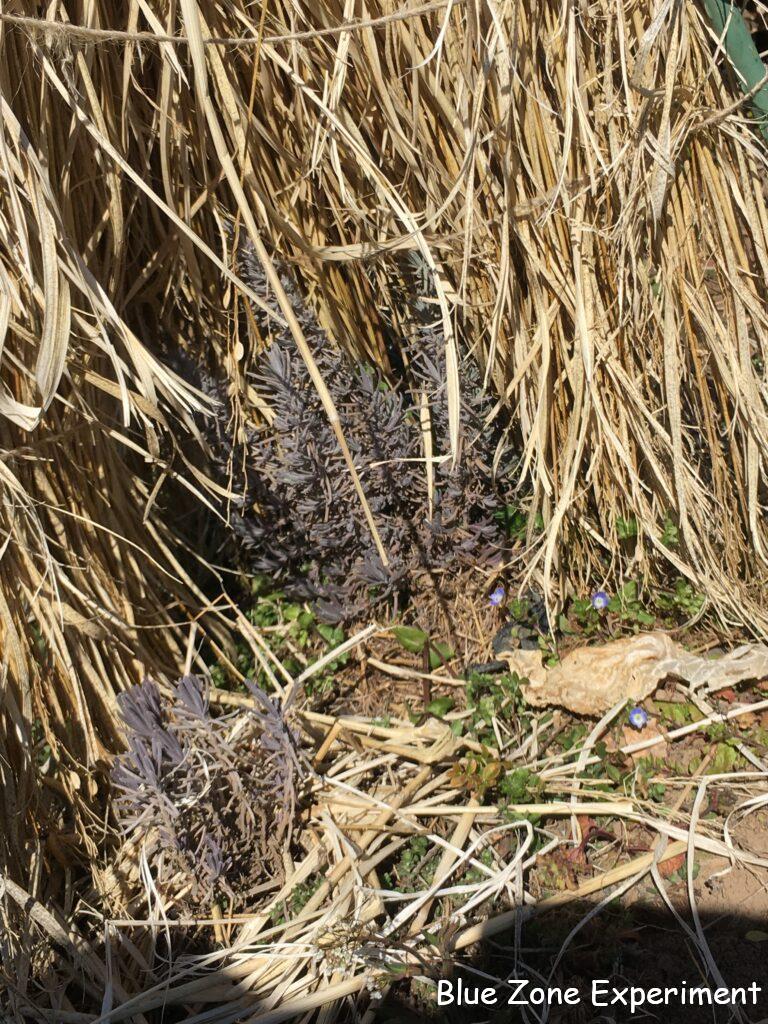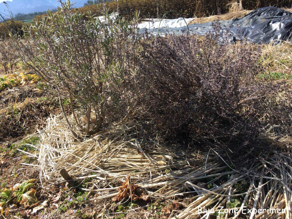 同じく藁で守ったラベンダーはどうでしょうか? 葉っぱはすっかり枯れているので、どうなのかよくわかりませんが、茎の部分は木質化して強そうなので、新しい葉っぱが出てくることを祈っています。ローズマリーとタイムは、下に藁を敷いただけだったのですが、ローズマリーは本当に寒さに強いようで、青い葉っぱが残っています。タイムはすっかり茶色くなっていますが、去年もこんな風だったので、復活することは間違いないでしょう。