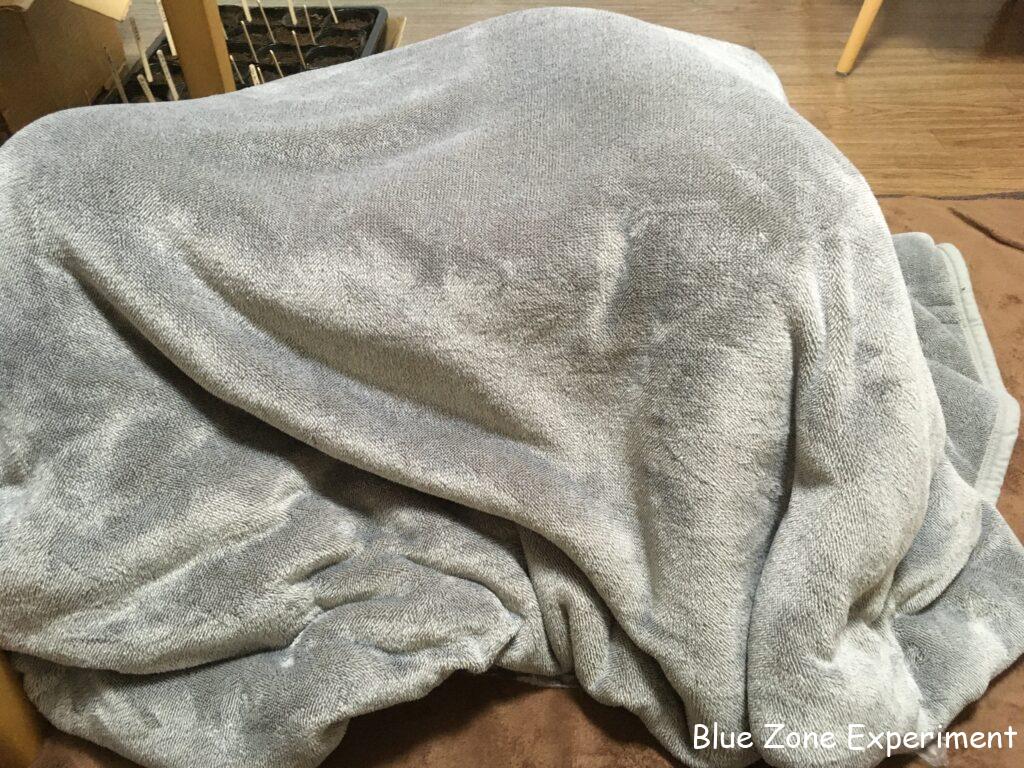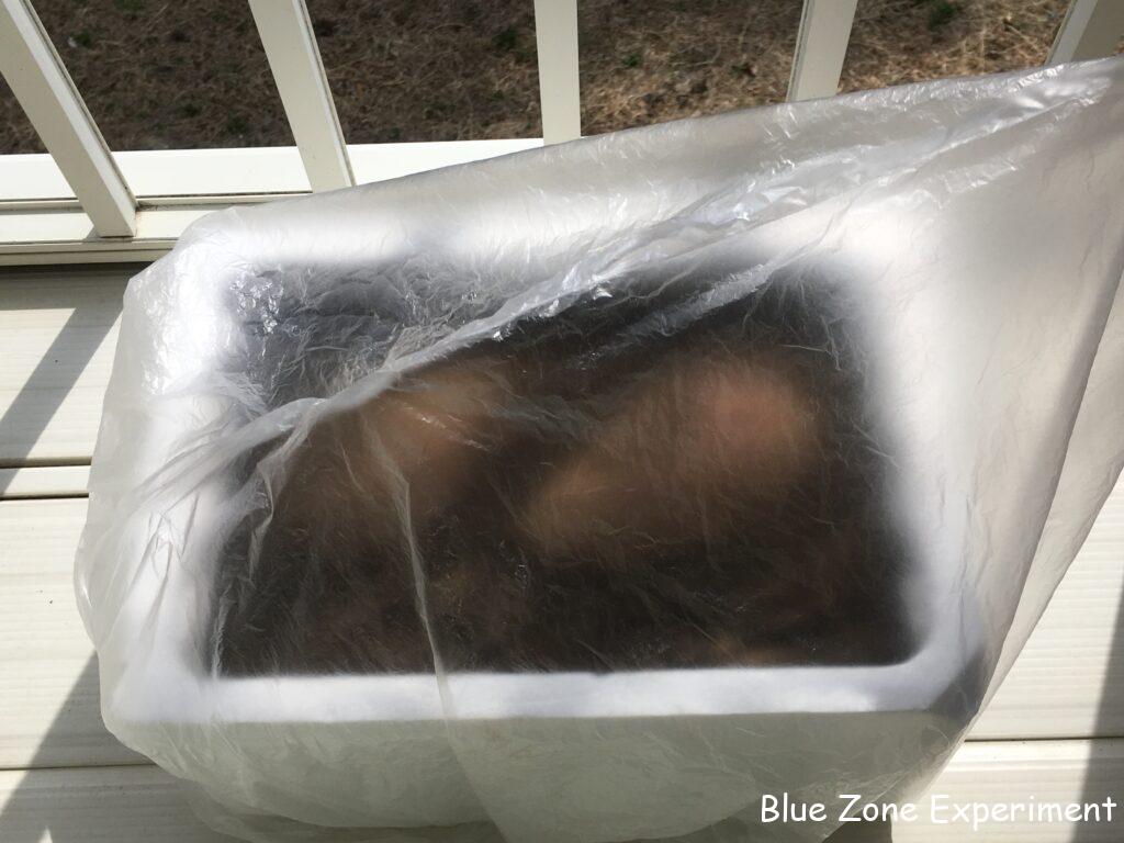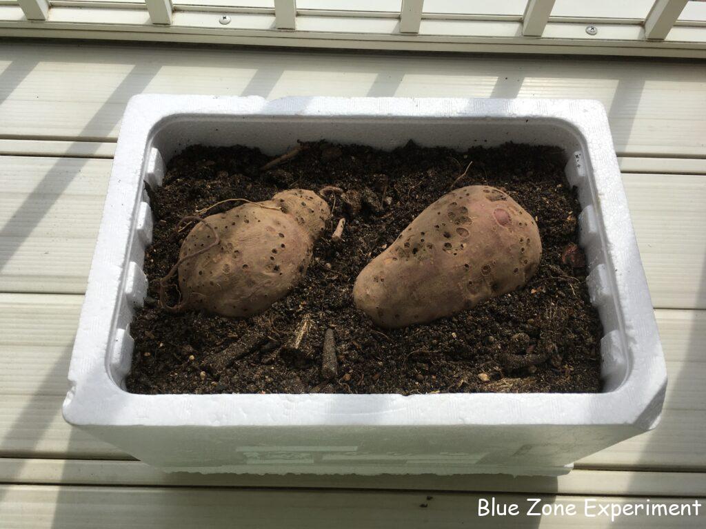 今回やったことは、穴を開けた発泡スチロールの箱に、枯草を入れ、その上に、発酵の進んだコンポストの中身に米ぬかともみ殻燻炭を混ぜたものを入れました。発酵を促進して温度を上げようという考えです。そして、そこに芋を少しだけ埋めるように入れました。呼吸できるように穴を開けたナイロン袋をかぶせて、昼間は日向に出し、暑すぎるときはナイロン袋を外していました。夜は、熱湯を入れた水筒と共にエアキャップで包んで、さらに毛布でくるみました。これで、夜間も 20 ℃は保っている感じでした。ところが、昨日芋を触ってみると、フニャフニャして腐っているようです。3 月 17 日に開始して、ほんの 5 日後のことです。日向に出しているときにかなり温度が上がっていたので、そのせいでダメになったのか、あるいは、もともと寒さで傷んでいたのかは不明ですが、とにかく失敗です。
