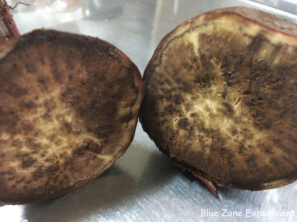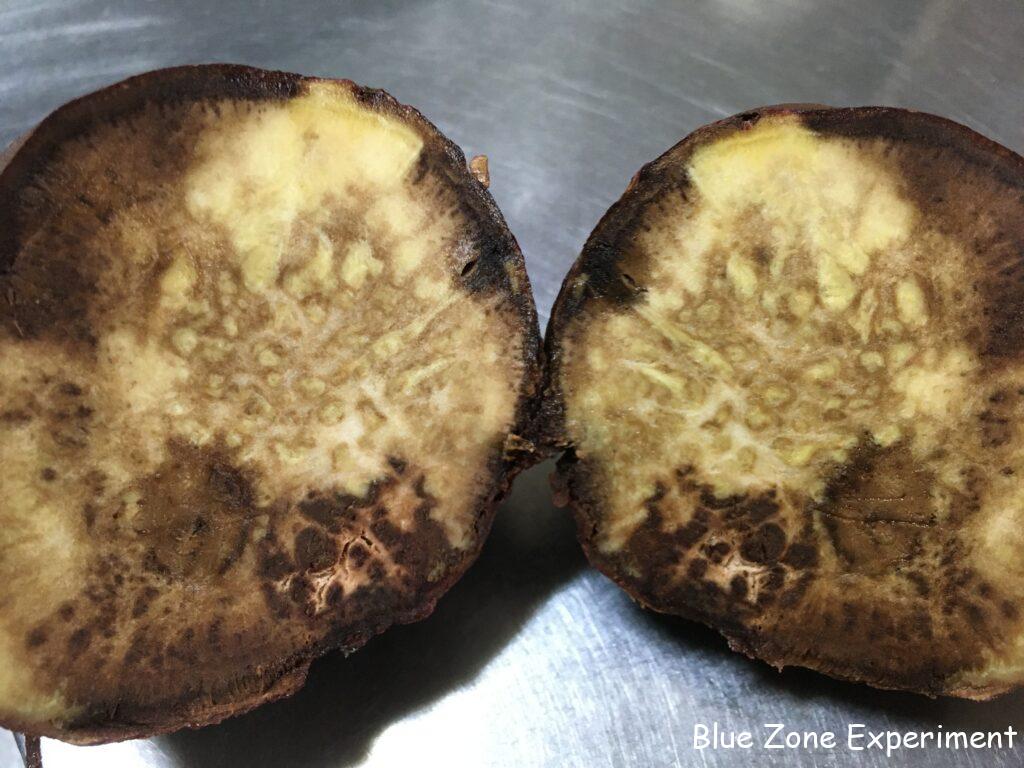 やわらかくなってしまった芋を切ってみると、二つともすっかり腐っていました……。どちらもコンポスト行きです。