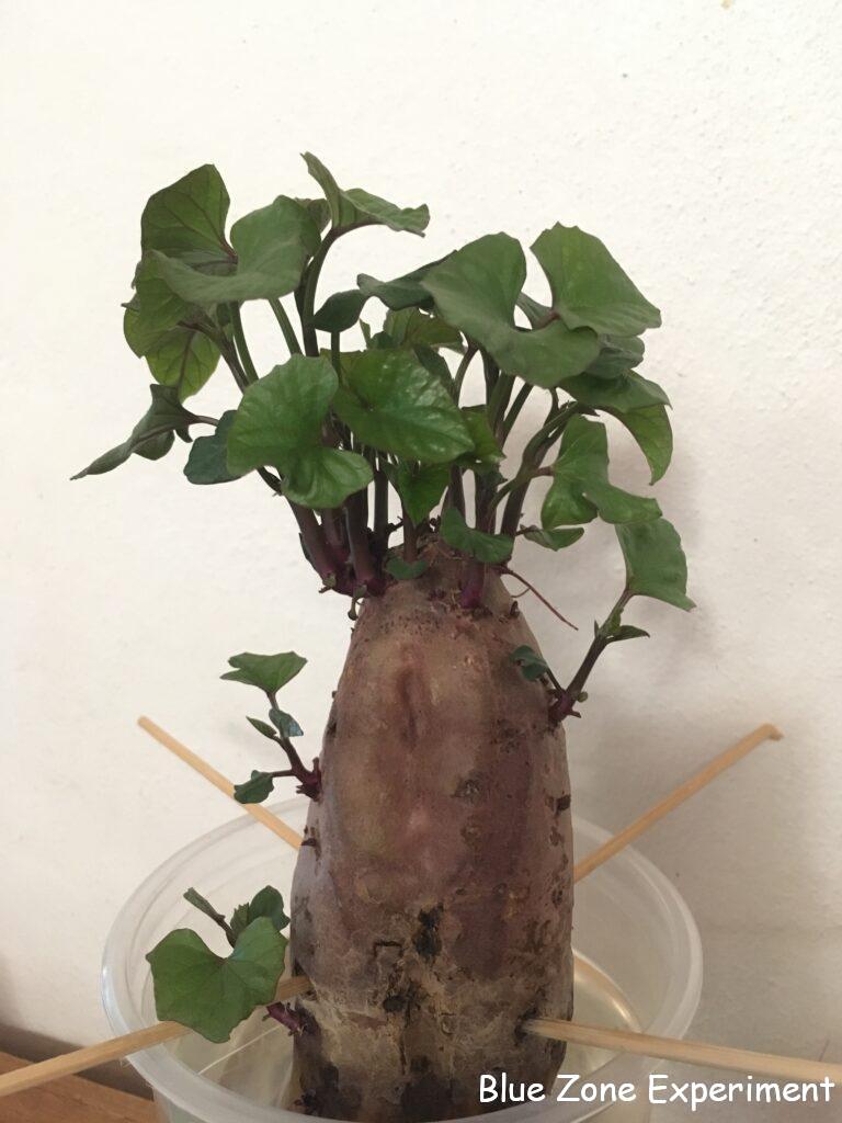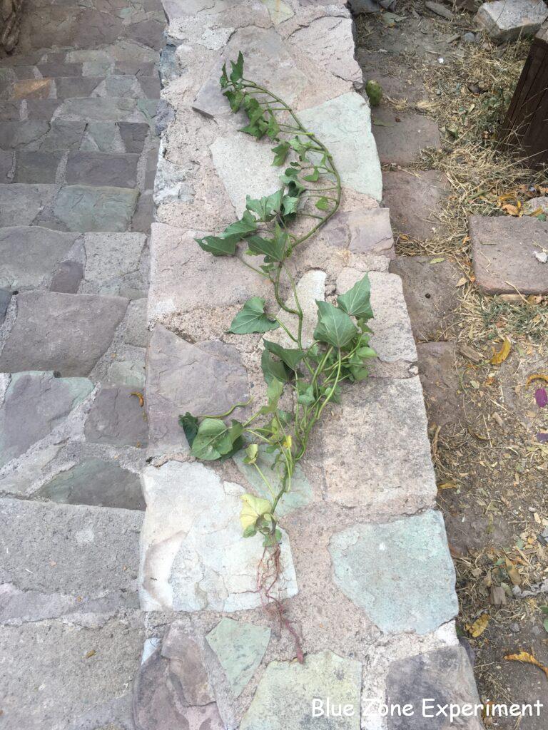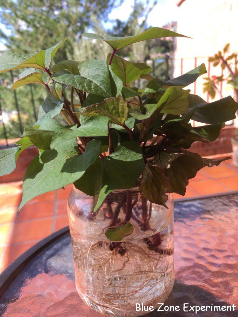 そのときはサツマイモの栽培方法など全く知らなかったのですが、これを増やすことはできるんだろうか? と思い、調べてみると、芋を水につけて苗を作る方法が紹介されていました。これなら簡単だと思い、水につけてみると、暖かいメキシコなので、どんどん芽が出てぐんぐん育ちました。そのつるを切って水につけておくと、根がどんどん伸びてきました(今思えば、そんなに根を伸ばすまで水につけていてはダメですよね)。