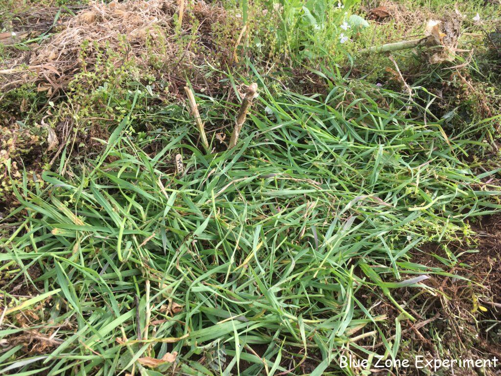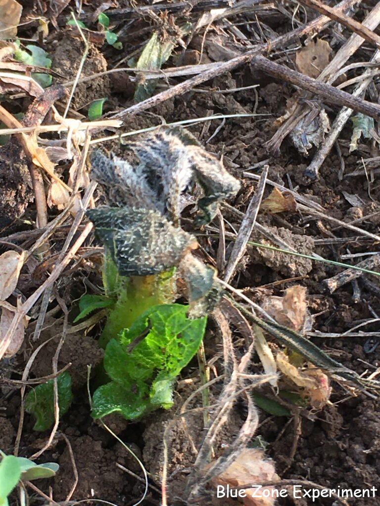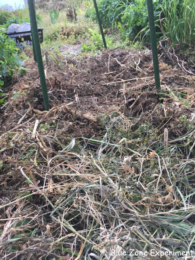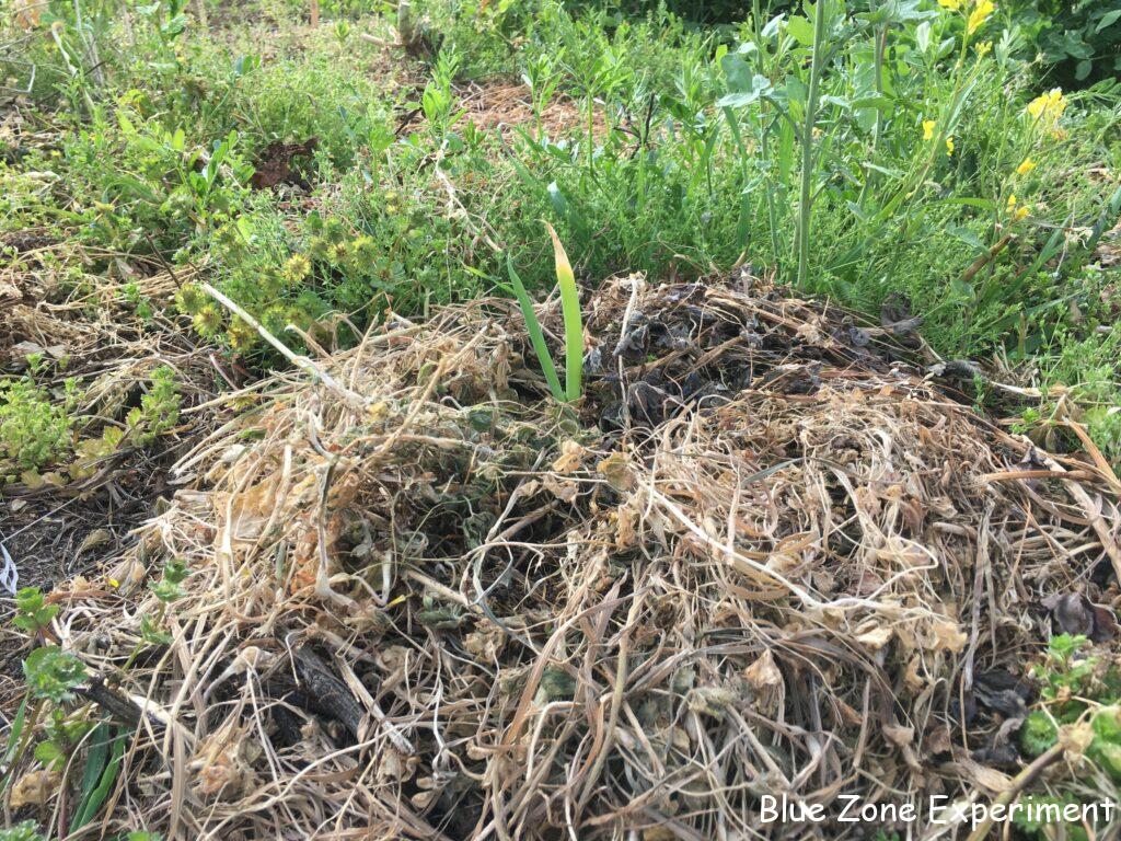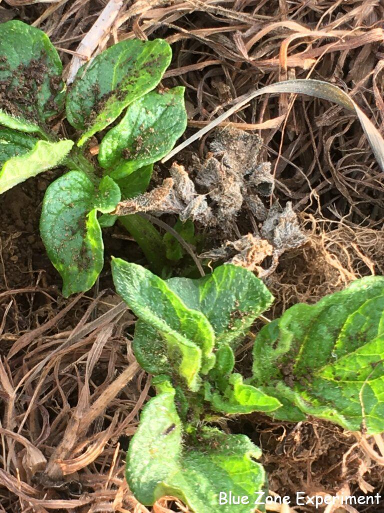 ちょうど一週間前、ジャガイモの霜対策として、出てきた芽に土や草をたっぷりかけました。しかし、十分だと思った被覆は、ジャガイモの成長に追い付かなかったようです。伸びすぎて草から飛び出した一部の芽が霜にやられています。そうはいっても、多くの株は、土と草で十分守られていたので、幸い被害は最小限です。今日は、伸びた茎の周りに土を寄せて、さらに厚く草で覆いました。日が当たらなくなってしまうのですが、霜で枯れるよりはマシなはずです。来週の月曜日から木曜日までは最低気温が一桁なので、それを乗り切れば一安心というところでしょうか。