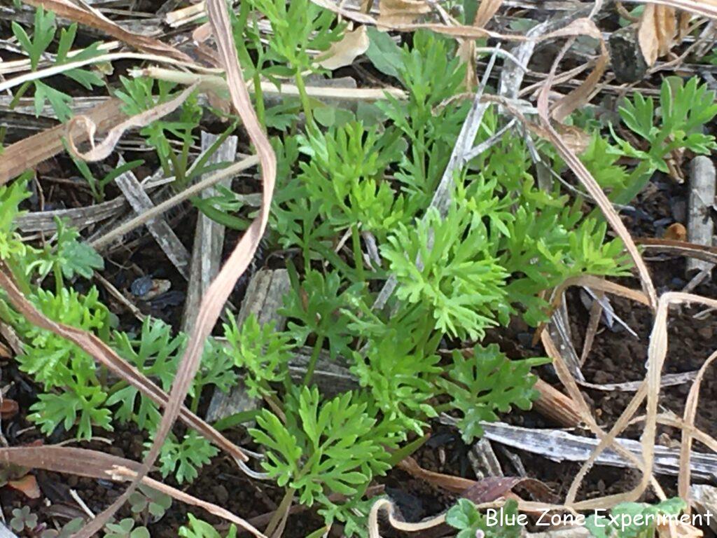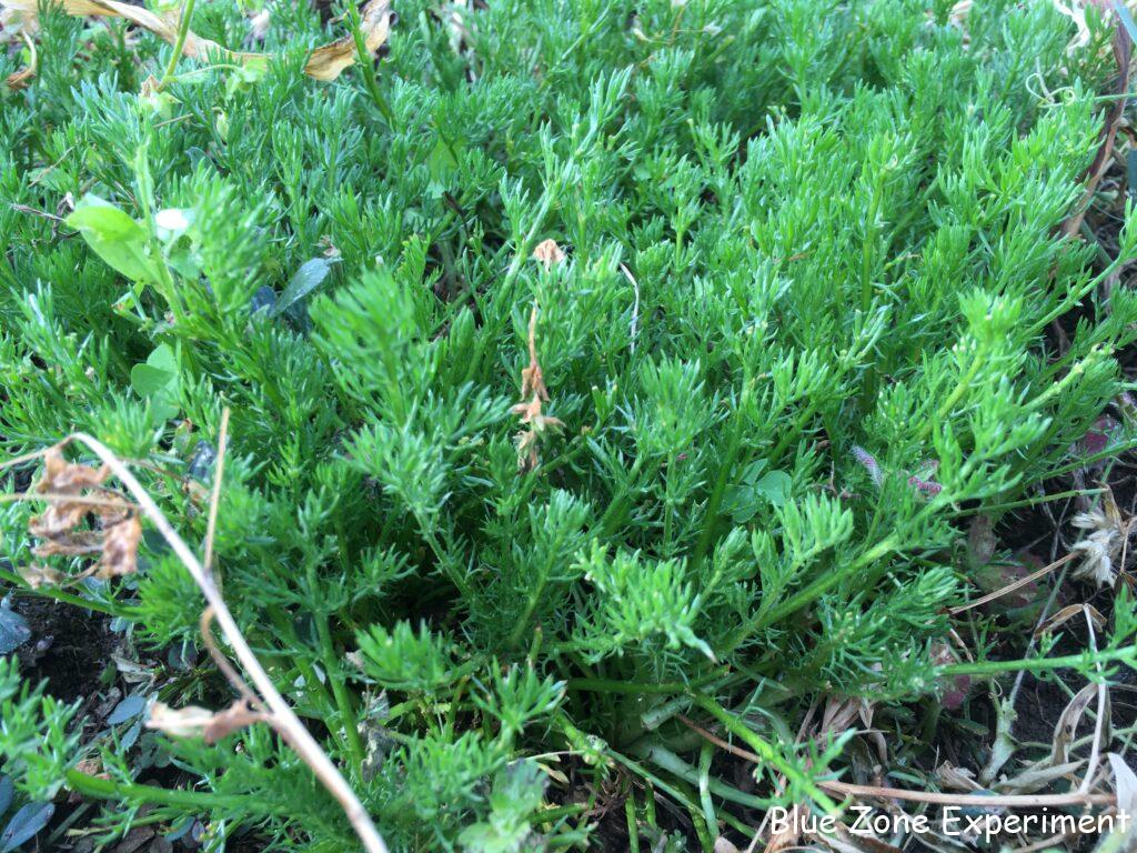去年の春に種をまいたローマンカモミールは、一年たって、やっと力強く葉を伸ばし始めました。ほとんど消えそうになりながらもなんとか生き残ってここまで大きくなってくれて、ほんとうにうれしいです。花が咲くのが待ちきれません。通路にまいたアフリカンマリーゴールドも順調に発芽しています。踏みつけそうな場所なので、十分気を付けなければなりません。