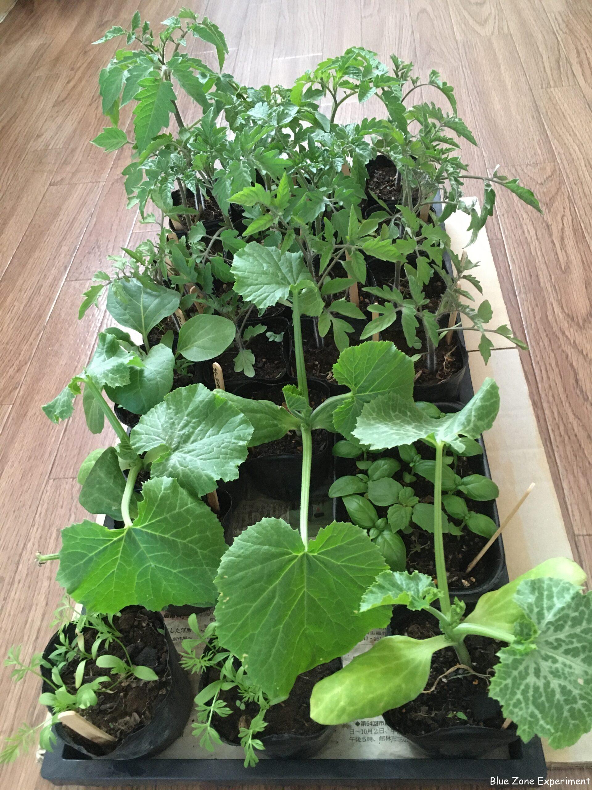 今日植え付けるのは、去年自家採種したステラミニトマト 4 株、種苗交換会でいただいた中玉トマトのサンマルツァーノ 5 株、それから品種はわかりませんが、おそらく中玉の加熱用トマト 5 株。サンマルツァーノも加熱に向くので、今年は加熱用が主流です。それから同じく種苗交換会で入手したズッキーニ二種。緑のブラックビューティー 2 株 と、品種名不明の黄色ズッキーニ 2 株 。それからアップルグリーンナス(大きくなった一株のみ、種苗交換会)、ニゲラ(種苗交換会)、スイートバジル(去年のメボウキべと病にかかった株から採種した種は廃棄して、新たに購入した種から育苗)、青ジソ(自家採種)です。