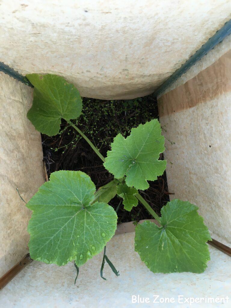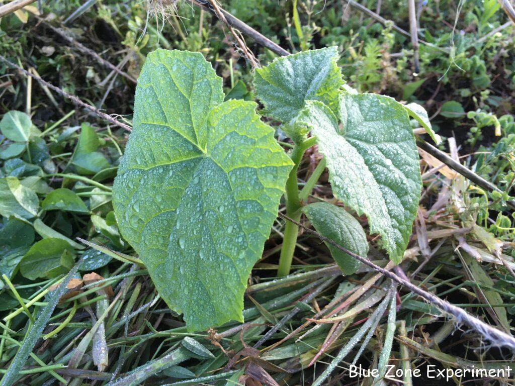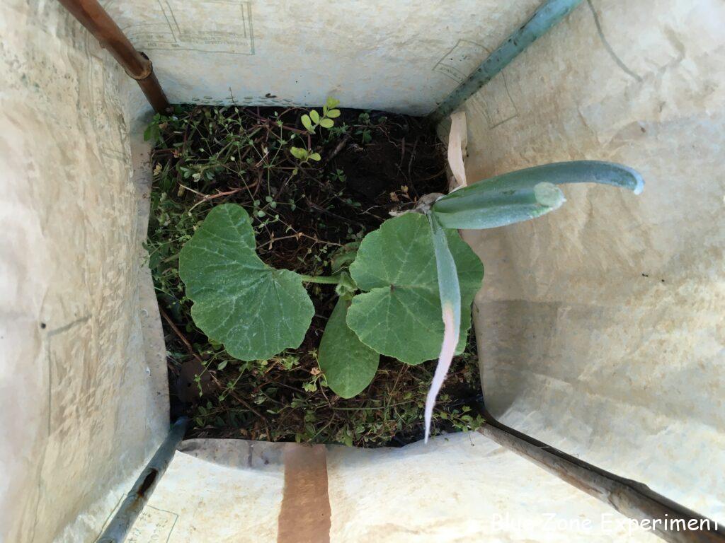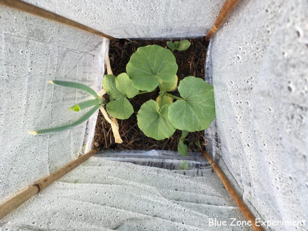 3 日前に定植したウリ科の野菜はどうでしょうか? キュウリとスイカは変化なしです。カボチャは、一株少し黄色くなってしまいました。老化していた苗なので、活着が悪いのかもしれません。直まきした分も発芽しているので、もしかしたら、直まきの方を残した方がいいかもしれません。12 日前に定植したズッキーニは、まずまずです。あんどんなしのキュウリがウリハムシに全く食べられていなかったので、ズッキーニもきっと大丈夫だろうと思い、あんどんから出しました。せっかくの太陽光、直接浴びた方が気持ちよさそうです。