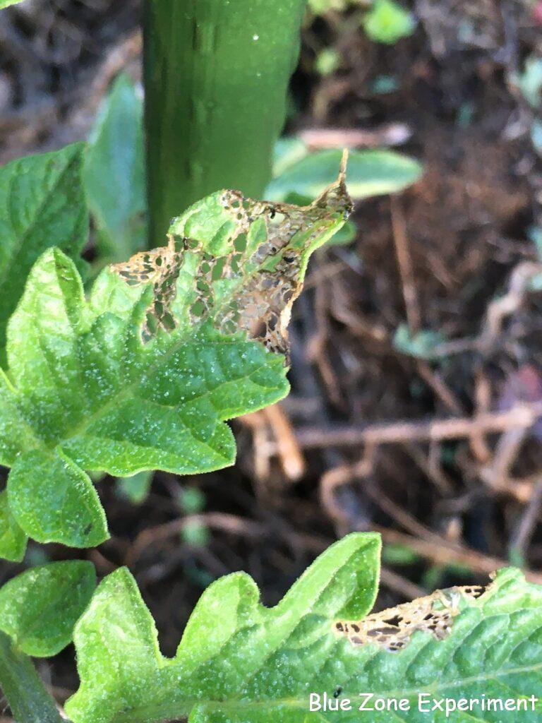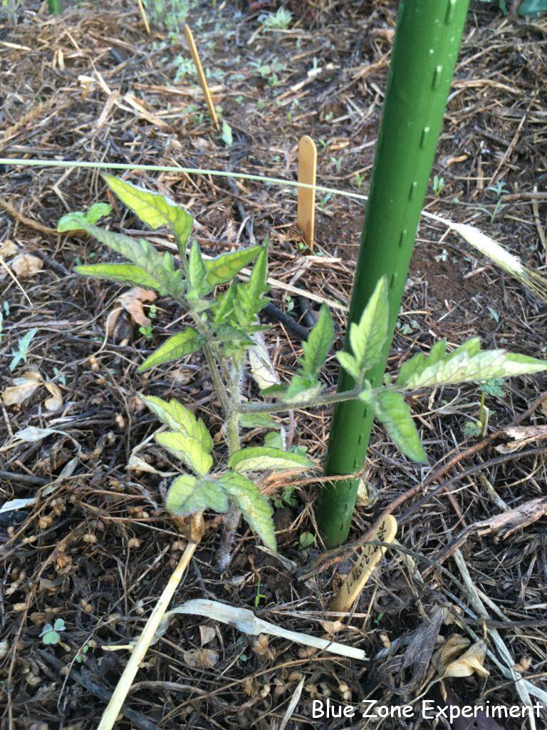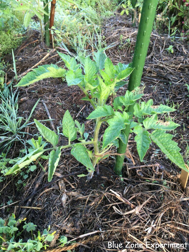 トマトもかなり弱っています。定植前は生き生きと元気で美しかった苗が、畑に出したとたんに弱っていくのを見るのはつらいものです。でも、去年もかなり悪い状態になりながらも生長してくれたので、なんとか生き延びてくれることでしょう。