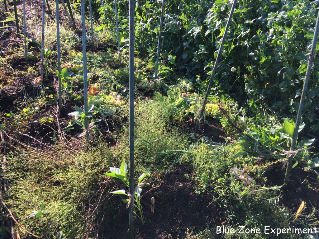 ピーマンは、トマトの支柱の東側、パレルモは西側に植えました。ナス科ばかりの畝になってしまいました。