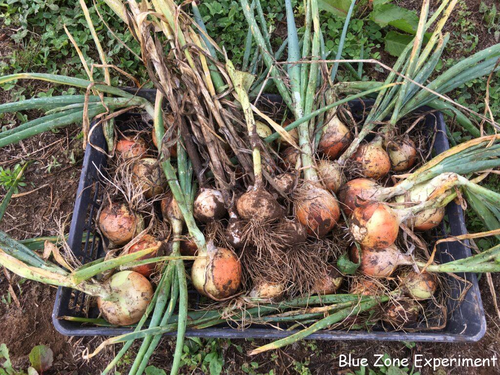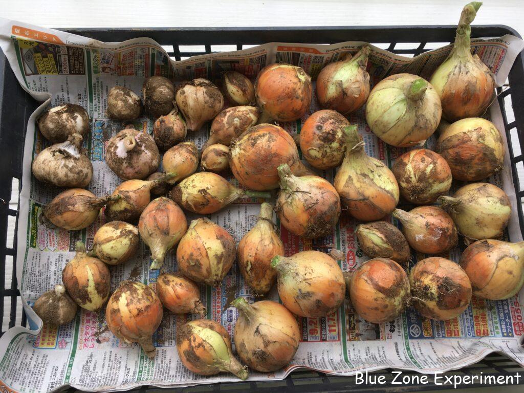 タマネギは、10 月 12 日、27 日、31 日の 3 回に分けて植えました。最初に植えた安売りの干からびた赤タマネギは、一つだけ親指大のものが残りましたが、あとはすっかり消えてしまいました。二回目に植えた中生種も苗がよくなかったのですが、ピンポン玉程度に終わりました。最後に植えた道の駅で買った苗は、なかなか健闘してくれました。二か所に分けて植えたのですが、高畝の方はほとんど大きくならず、藁で風よけをしたところの方がよく育ちました。その一か所だけは、はじめて収穫するタマネギにしてはよくできたと思います。もちろん、自然農をはじめたばかりの畑にしては、ということですが。