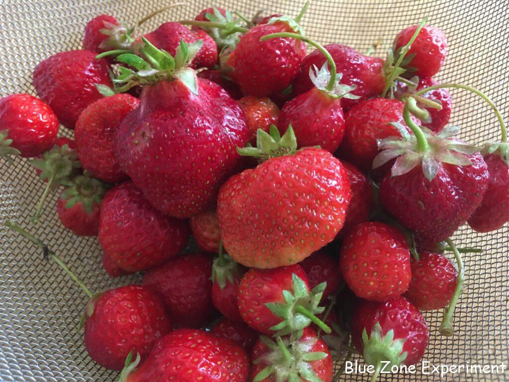 二日前に収穫したばかりなので、イチゴはもうほとんどないだろうと思っていたのですが、今日も 55 個収穫できました。小さい実が多いですが、甘くておいしいです。今日は、ワイルドストロベリーも少しだけ収穫しました。去年も感動しましたが、香りが本当に素晴らしいです。あとは、大さやえんどうとサニーレタス、それからバジルを摘芯収穫しました。