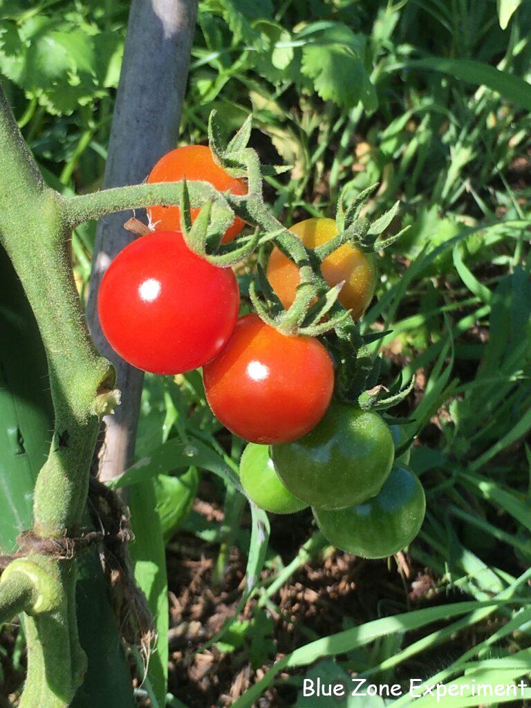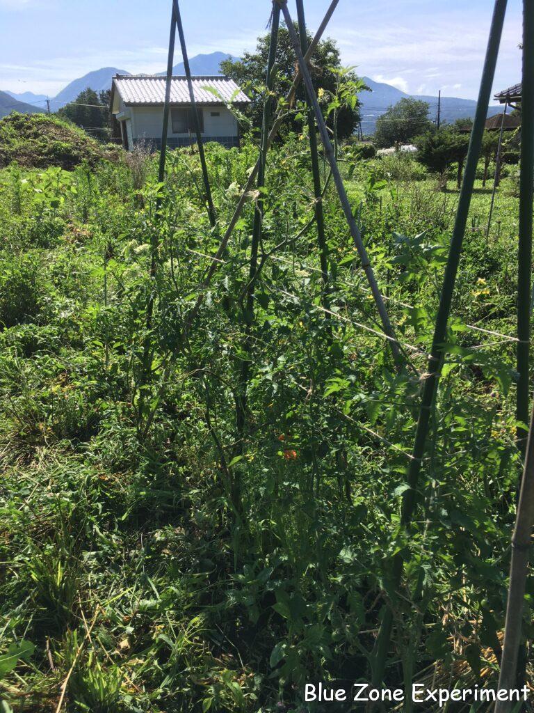 トマトやキュウリなど、背が高くなる作物は、草にも負けず成長していました。特にトマトは順調で、ミニトマトは、実も赤くなり始めました。株元の草を刈ったあと、枯れた下葉を取り除いて風通しをよくしました。暴れないように誘引して完了! 他の夏野菜もだいたい元気そうです。小玉スイカは、調子が悪かったので駄目かと思っていましたが、小さな実がいくつかついているのを確認しました。