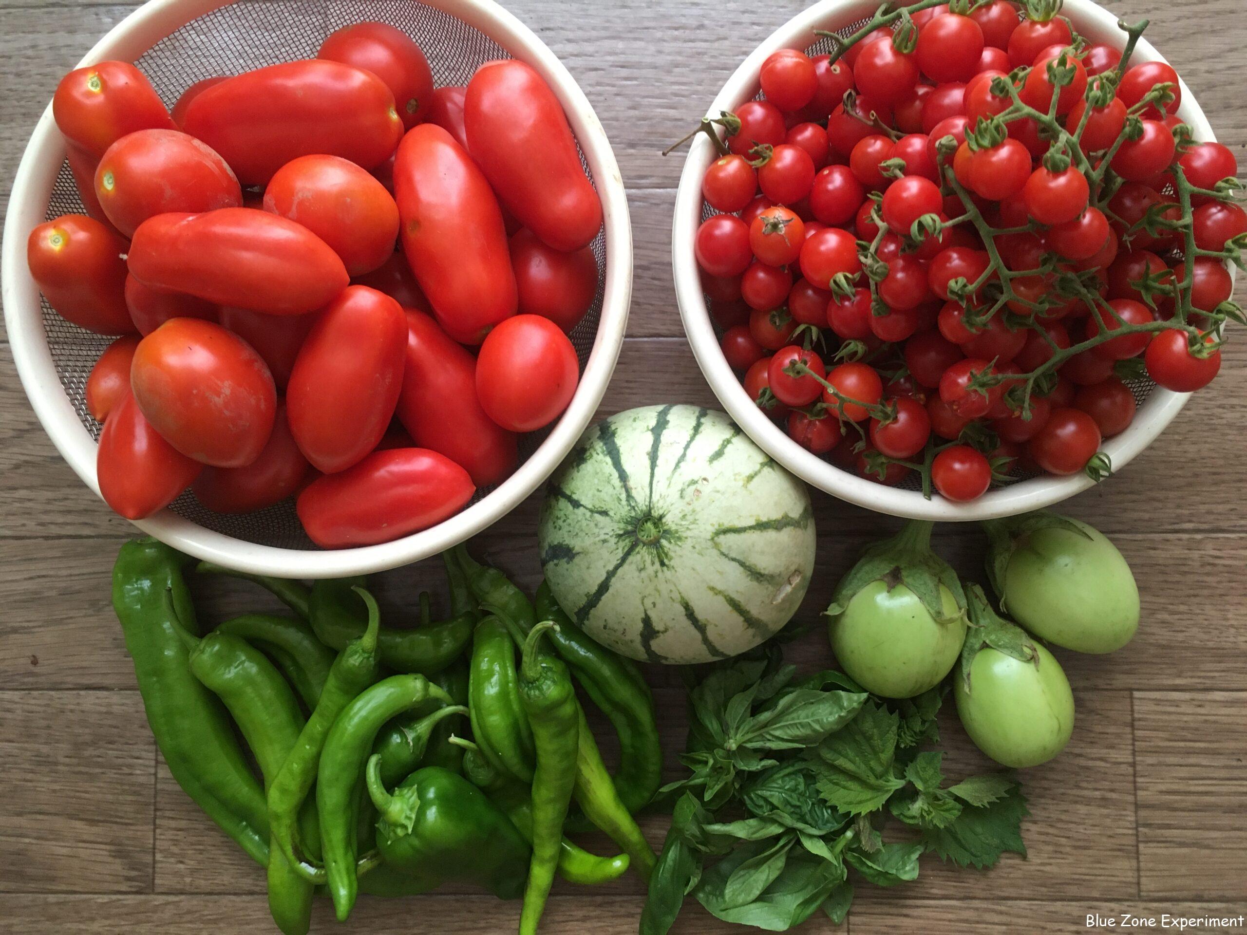 今日はトマトをたくさん収穫しました。あとは、万願寺とうがらしとピーマン、シソとバジル、アップルグリーンナス、それから小さいスイカ。小玉スイカですが、それにしても小さめで、色も悪いです。何者かの爪痕のようなものもあります。大きさは、前回見たときから変わっていないようで、収穫の目安である巻ひげは茶色くなっていたので、おいしそうではありませんが収穫しました。