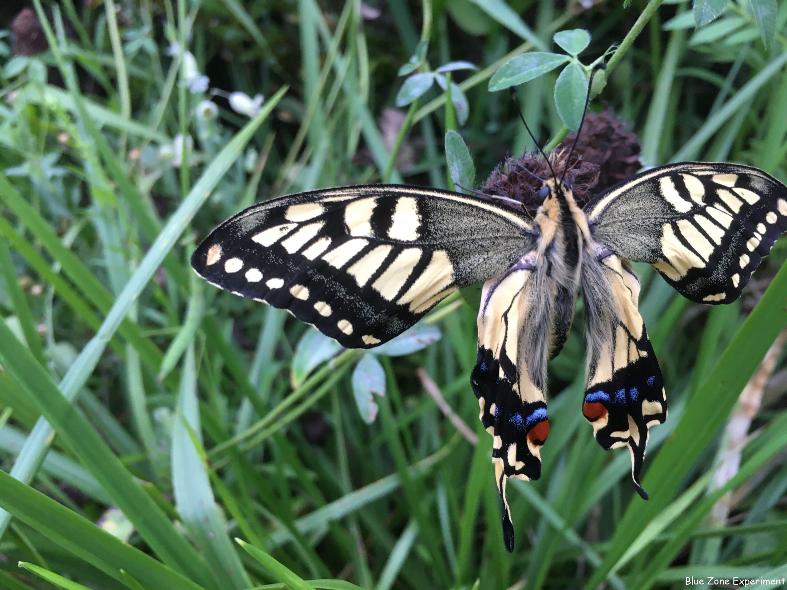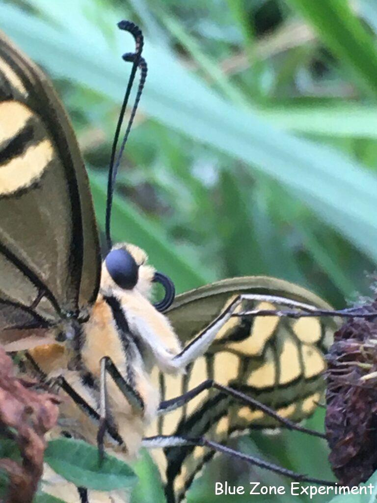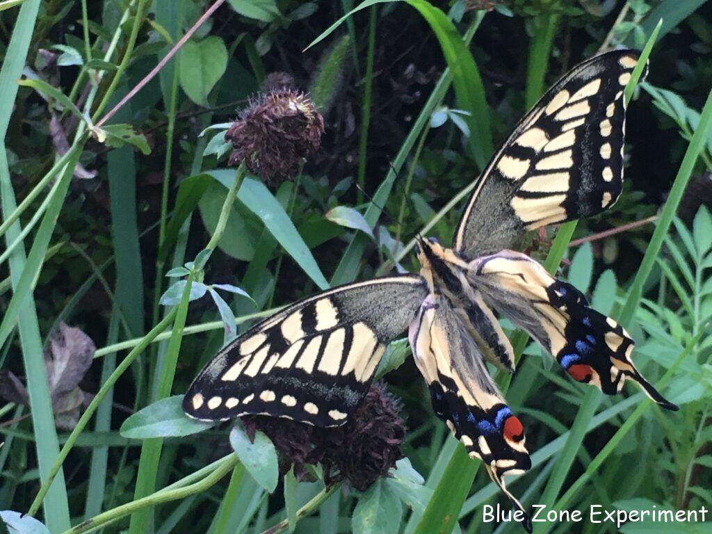 作業中にキアゲハを発見しました。近づいても逃げません。よく見ると、羽化したばかりのようで、まだ翅がすっかり伸び切っていないようです。じっと翅を乾かしているところでした。しばらくしてから見に行くと、まだ同じ場所にいます。ここはこの前カマキリがいた場所。無事を祈りながらそっとしておきました。次に見に行くと、草の上に落ちていました。翅は傷ついていないようです。そっと近くにあったローズマリーに移動させると、翅を小刻みにばたつかせ始めました。翅を乾かすためでしょうか? しばらくそうしていたあと、飛び上がったものの草の上に着地。でも、すぐに飛び立っていきました!