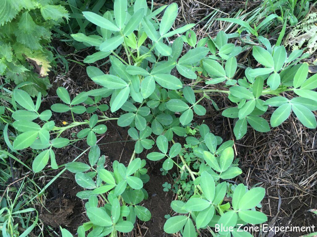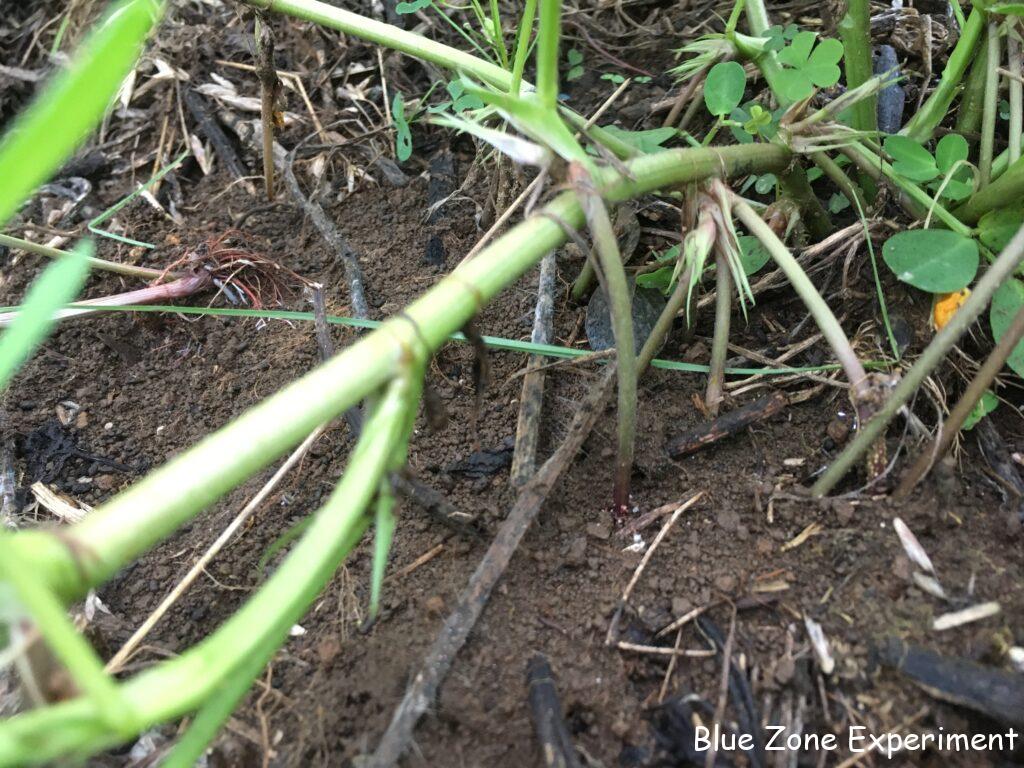 元気に育つ落花生の子房柄も撮影してみました。横に伸びる茎から下に向けて何本か足が出ています。これが土に突き刺さり、土の中で成長して落花生になります。