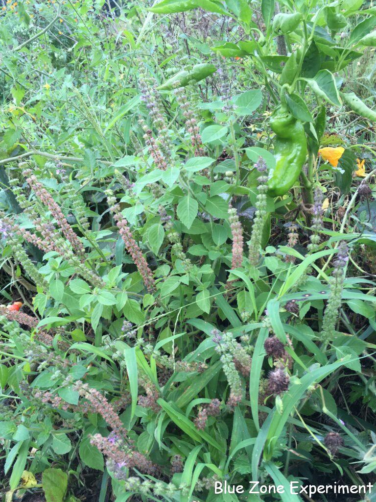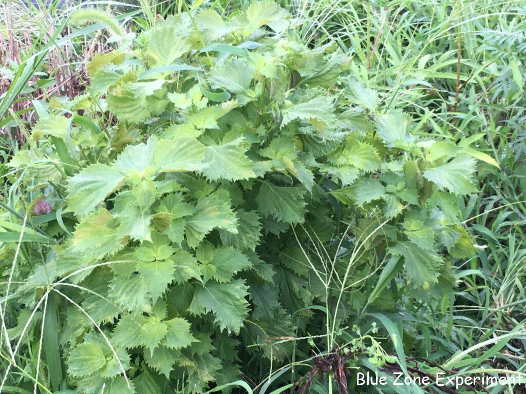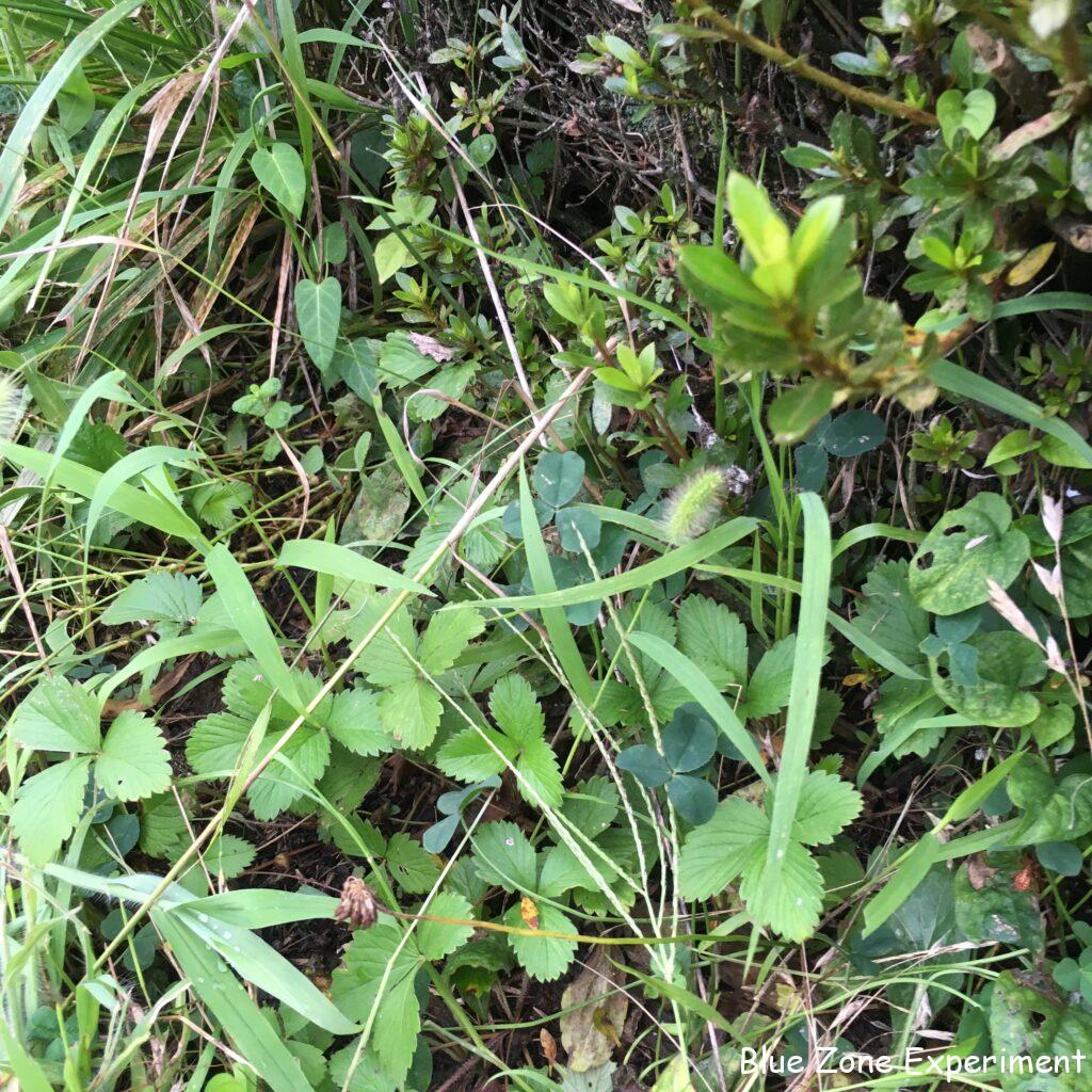 草に埋もれていたのでヨレヨレではありますが、ニラは何とか生き延びています。苗を購入したときについていたネームプレートが立ててあるので、草に埋もれていても見つけやすかったのでよかったです。自分で立てた木の棒では、名前が書いてあっても目立たないので、草と一緒に刈ってしまったものが数知れず。青ジソは、日焼けしたのか黄色っぽくなってきました。虫食いも目立ってきました。でも、どの株も巨大なので、収穫には困りません。今年収穫の機会がなかったホーリーバジルは、すっかり花が咲いてしまいましたが、何か所かに大きな株があります。タイミングが合えば採種しようと思います。畑と農園内の舗装路との間にツツジの生け垣があるのですが、その根元に、去年、ワイルドストロベリーの子株をいくつか移植しました。草を刈っていると、草に埋もれながらも元気に育っていました。猛暑が続く中、直射日光に当たらなかったのがむしろ良かったようで、もともとの場所のものよりもずっと健康そうです。