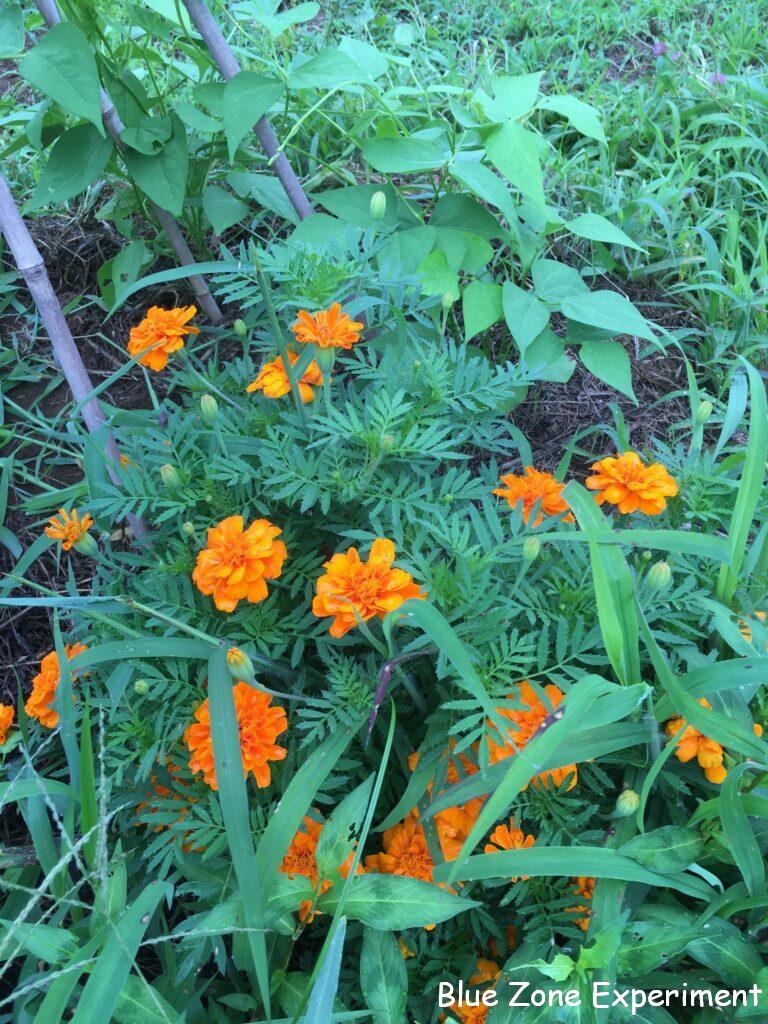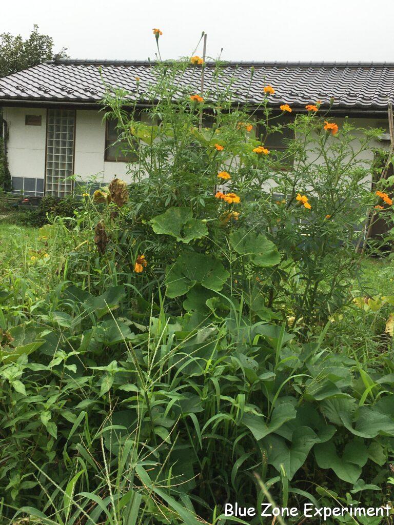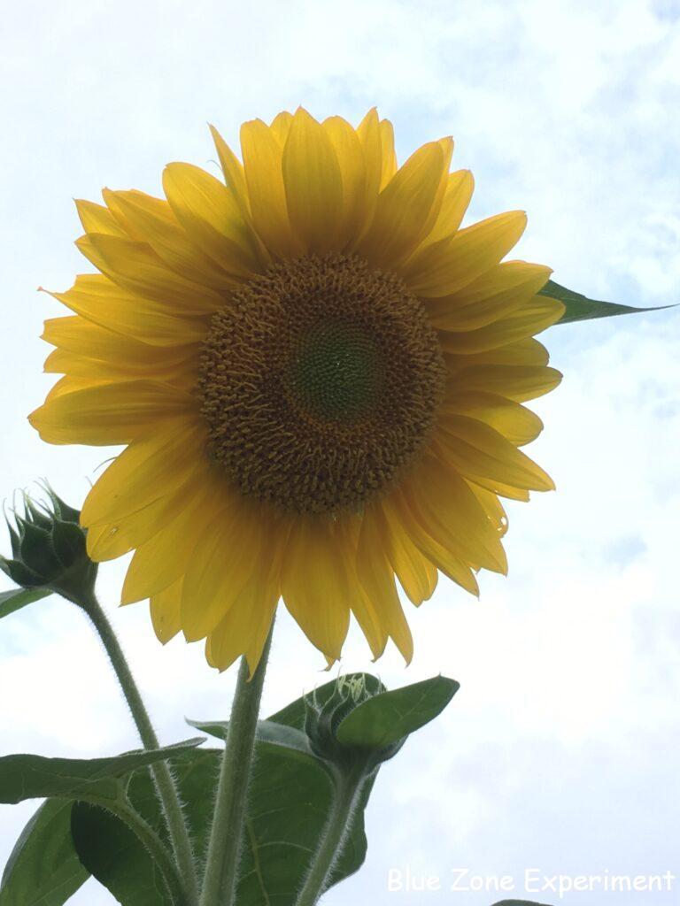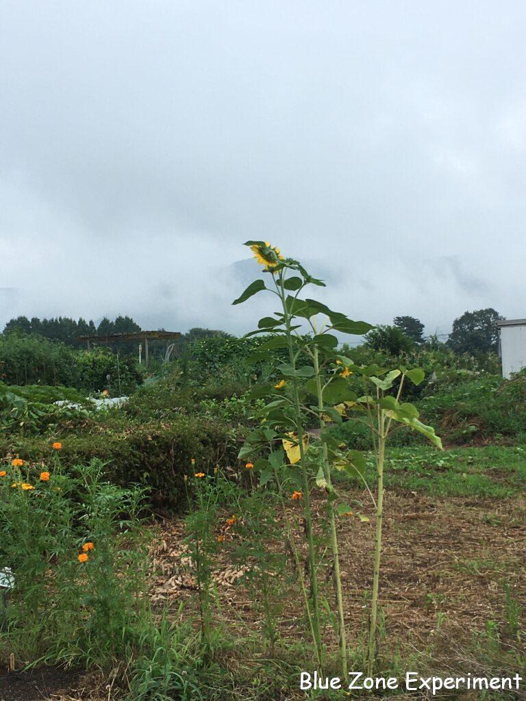 フレンチマリーゴールドは、少ししか発芽しなかったのですが、発芽して順調に育ったものは大きな株になっています。アフリカンマリーゴールドには、カボチャが這いあがっています。ナスタチウムは、猛暑に負けず頑張っています。グリーンカーテン用に不織布ポットで育てているものは、二週間ごとにしか水をやれないため、すべて枯れてしまいました。去年は長い期間美しい姿を見せてくれただけに残念ですが、これでナスタチウムは水が大好きだということがよくわかりました。隣の空き地との境界に咲いたヒマワリは、私の身長を大きく超えて 2 メートル近くまで成長しています。下から見上げると、薄曇りの空の色をバックに堂々としています。