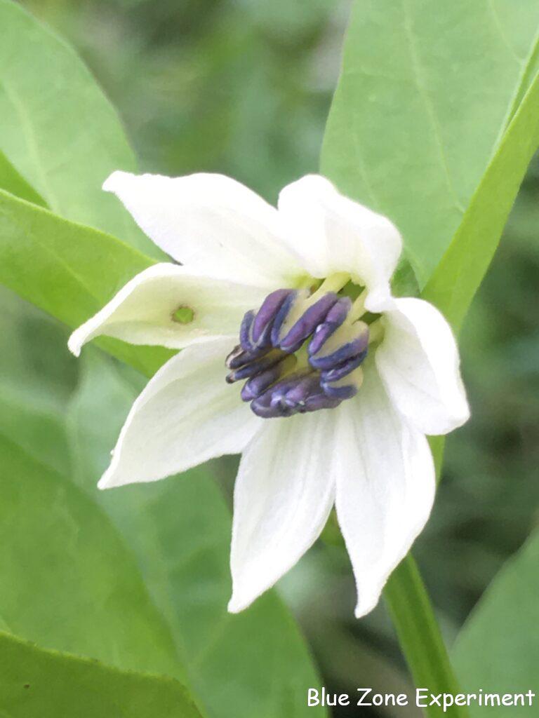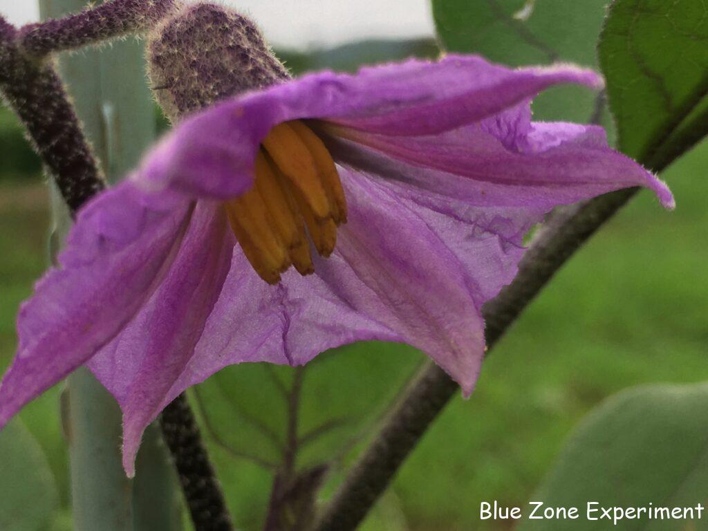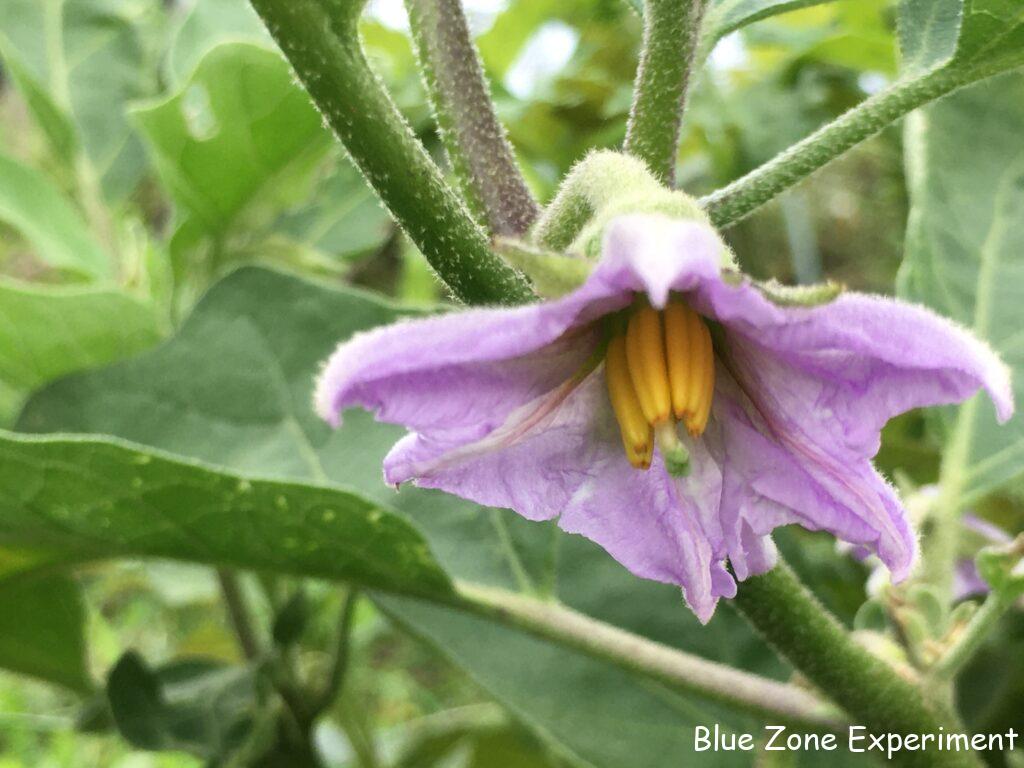 野菜の花はきれいです。ナスの花、よく見てみると、紫のナスの花の方が濃い紫で、アップルグリーンナスは薄い紫。どちらも花びらが紙細工のようです。ピーマンの花はおしべが紫で素敵です。