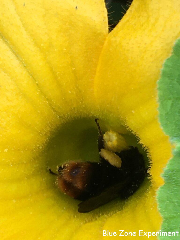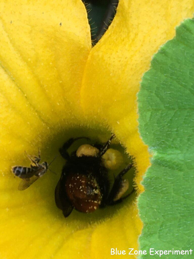 カボチャの花は蜂に大人気です。小さい蜂が大きい蜂のうしろで行儀よく順番待ちしています。