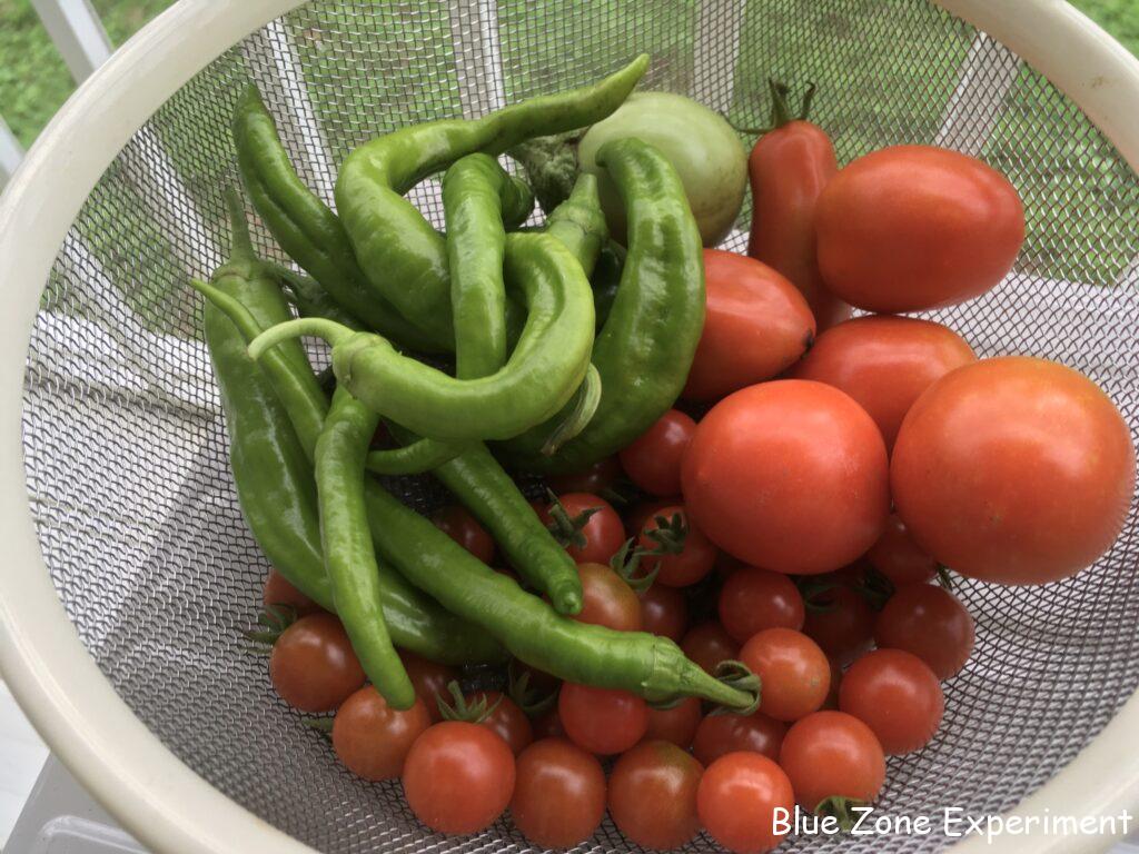 まだ真っ赤ではないものの、二週間後にはダメになりそうなトマトを収穫しました。雨のあとで水っぽくてあまりおいしくはありませんが、そのまま放置するのももったいないので料理に使おうかと思います。あとは伏見甘長トウガラシ、万願寺とうがらし、アップルグリーンナス。そして、キアゲハのためのニンジンです。
