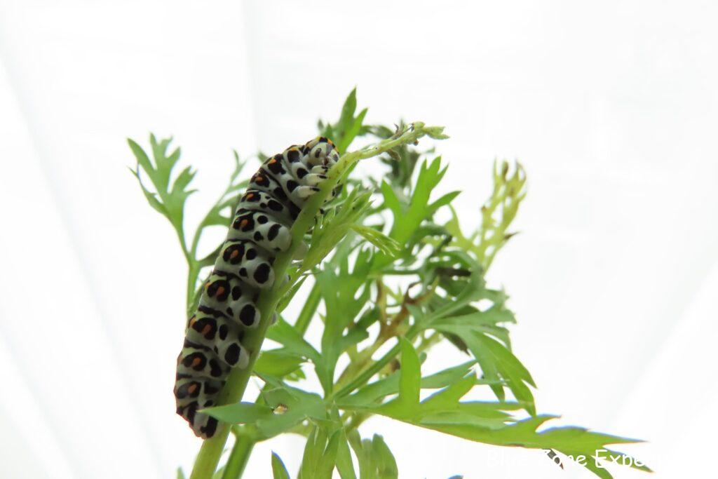 以前ニンジンと一緒に持ち帰った幼虫は、ニンジンの葉がなくなって以来アシタバの葉っぱをやっていたのですが、ニンジンの方がお好みのようで、採ってきたニンジンの葉っぱをやると大喜びで食べています。
