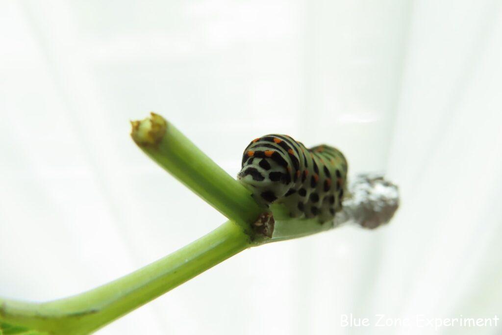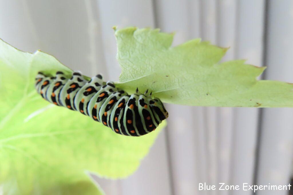 持ち帰ったニンジンの葉は、水につけておきましたが、暑いせいもあってか、あまり長持ちしませんでした。何とか持ちこたえた最後の葉っぱを食べ終わったので、庭のアシタバに切り替えました。ほとんど枯れていたアシタバですが、新しい葉っぱが何枚か出ていたので助かりました! たくさん食べて、幼虫は大きくなりました。もうすぐサナギになります。