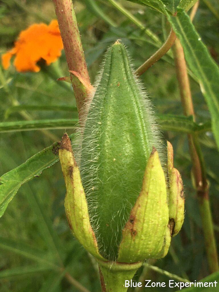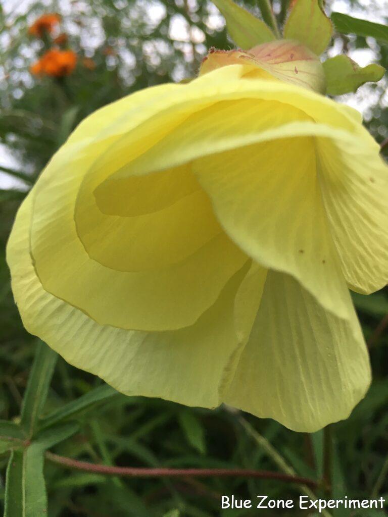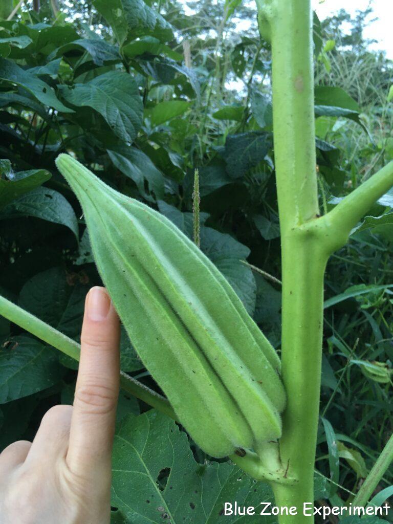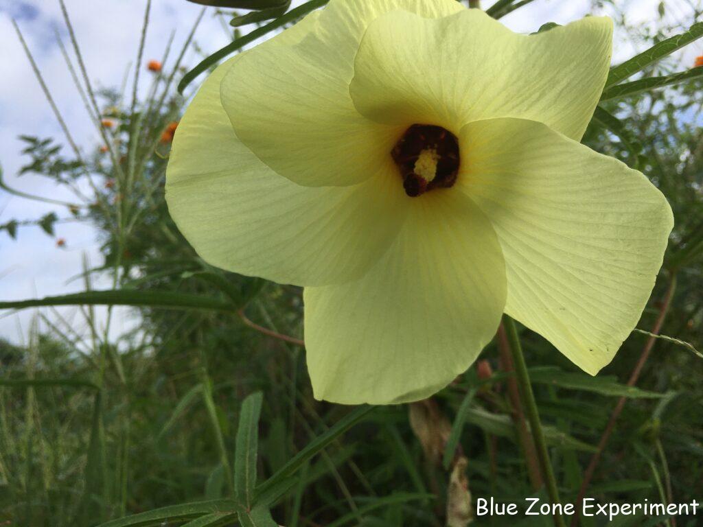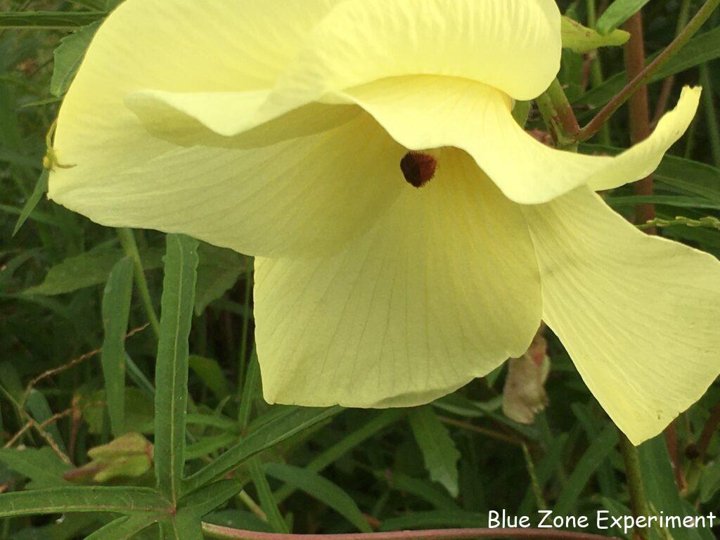 タイミングよく花を見ることはできないかもしれないと思っていた花オクラですが、美しいその姿を目にすることができました! 畑に行くと、草に埋もれたつぼみが見えたので、周りの草を刈りました。しばらくしてから見てみると、花がすっかり開いていました。薄黄色のきれいな花です。食用ですが、なんだかもったいないので写真だけ撮ってそっとしておきました。