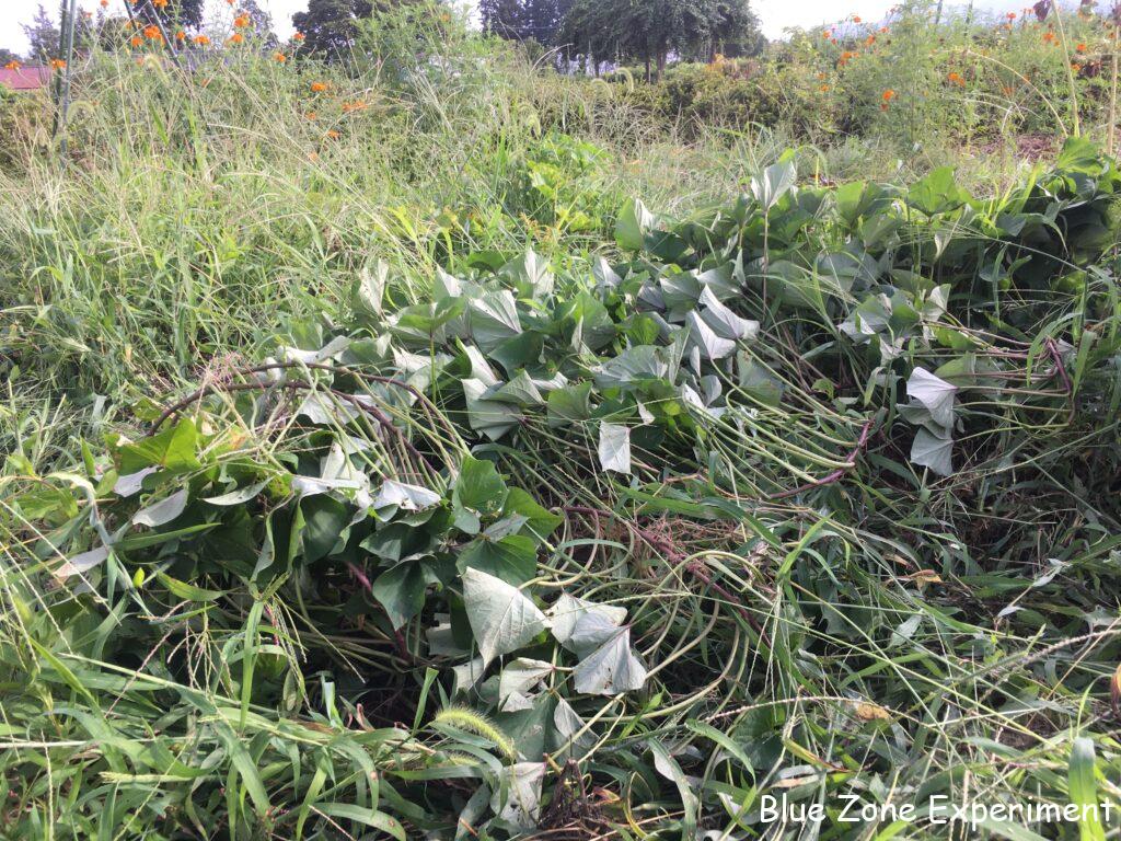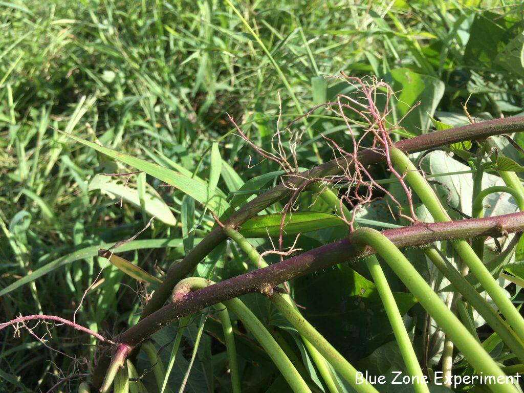 サツマイモのツルが伸びてきたので、ツル返しをしました。ツルが伸びると、ツルの途中から根が出るので、その根を地面から引きはがす作業です。余計な根っこに養分がいかないようにして、肝心の芋を太らせるのが目的です。ツルはそれほど伸びていなかったので、作業は簡単に終わりました。